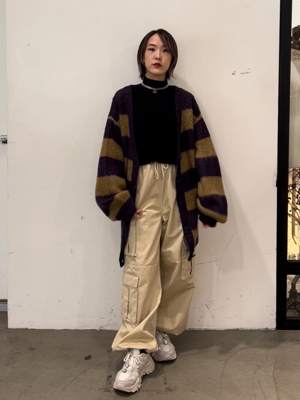 【カーディガン】154cmでお尻がしっかり隠れるゆったり大きめのサイズ感ですが軽く、プルオーバーなどの厚手のアイテムでも羽織れます。ハンガーにかけてしまうと伸びてしまうので、畳みでの保管がオススメ。柔らかい質感でしっかり暖かく着ることができますが、毛玉になりやすいので定期的な毛玉処理をオススメします。 【プルオーバー】スポーティーなポンチ素材のプルオーバー。つるっと着心地◎154cmで腰骨ぐらいのクロップド丈でハイウエストボトムとの相性抜群!ハイネックですが、余裕があるので苦しくないです。胸元のロゴはシンプルですが凹凸感がありアクセントに。 【パンツ】ルーズシルエットのカーゴパンツ。ハイウエスト仕様なのでスタイル良く見え、足首のドローコードを絞れば低身長の方でも床につく事なく履けます。厚手すぎない生地で軽さもあり履きやすさ抜群◎