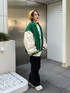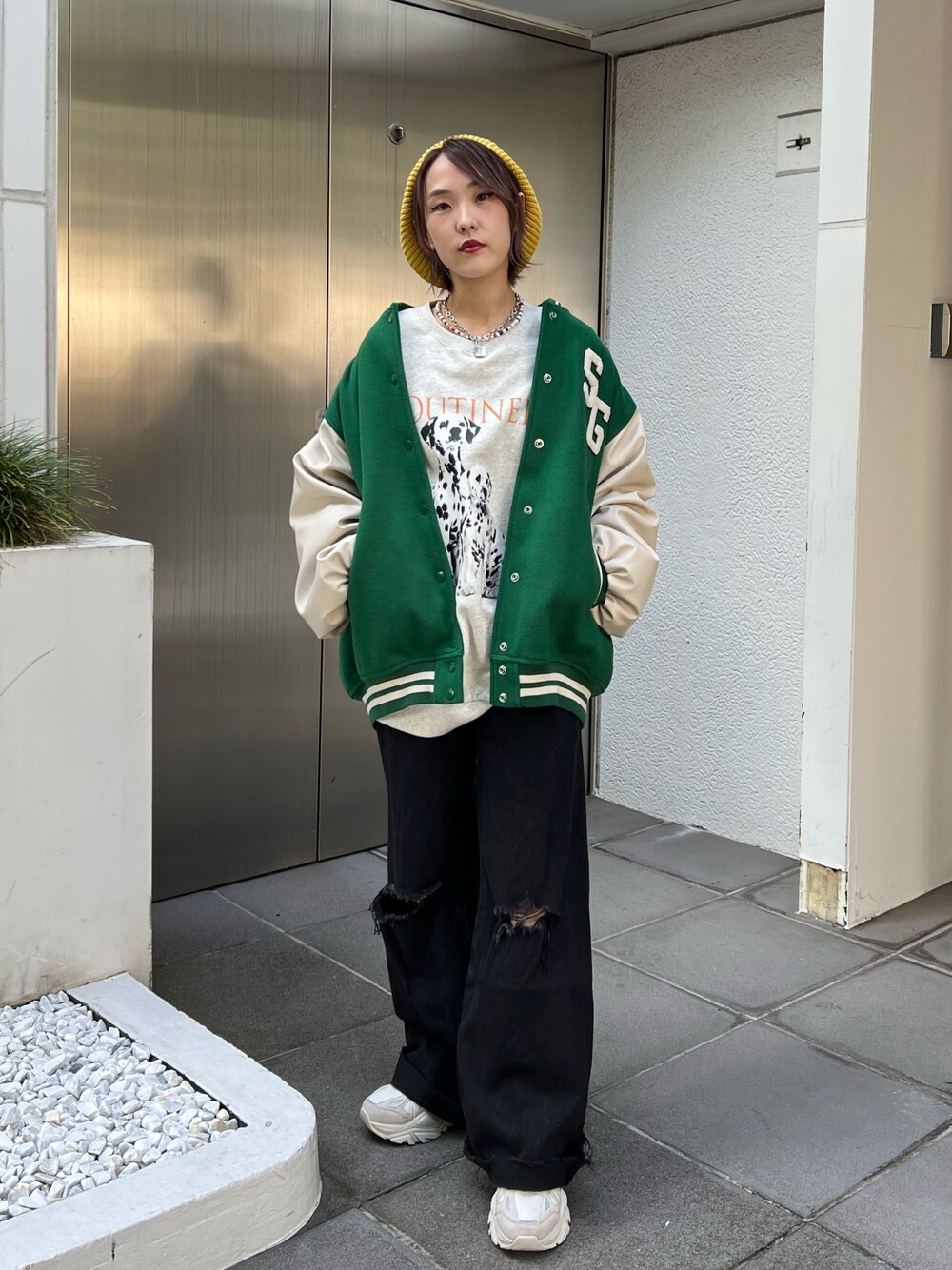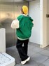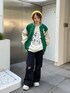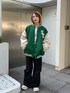 【アウター】 154cmでお尻がしっかり隠れるルーズなシルエットのスタジャン。身幅がゆったりしてるので厚手のトップスの上からでも羽織れますが、中がキルティングになってるので薄手のトップスでも暖かいです。 ルーズなシルエットが後ろからみた時に華奢見えします。軽いので着疲れすることなく着られるのも嬉しい◎ 【プルオーバー】 154cmでお尻が隠れる丈のルーズプルオーバー。脇部分は少しドルマンデザインのようにゆったりしてます。裏毛なので厚手すぎず薄手すぎず着やすく着心地も◎ヴィンテージ感のあるプリントで古着MIXのコーデが組めます☺︎ 【ボトム】 154cmでSサイズ着用。厚手のソールを履くか少しだけロールアップすれば地面につく心配はありません。ハイウエストで履けるので、ショートトップスやトップスインのスタイルが綺麗なシルエットになります☺︎ 【シューズ】 FILAとのコラボアイテム!厚底ですが軽いので長時間履く際にも疲れづらいです☺︎ビジュー取り外しできるのでシンプルスポーティにも履けます◎
