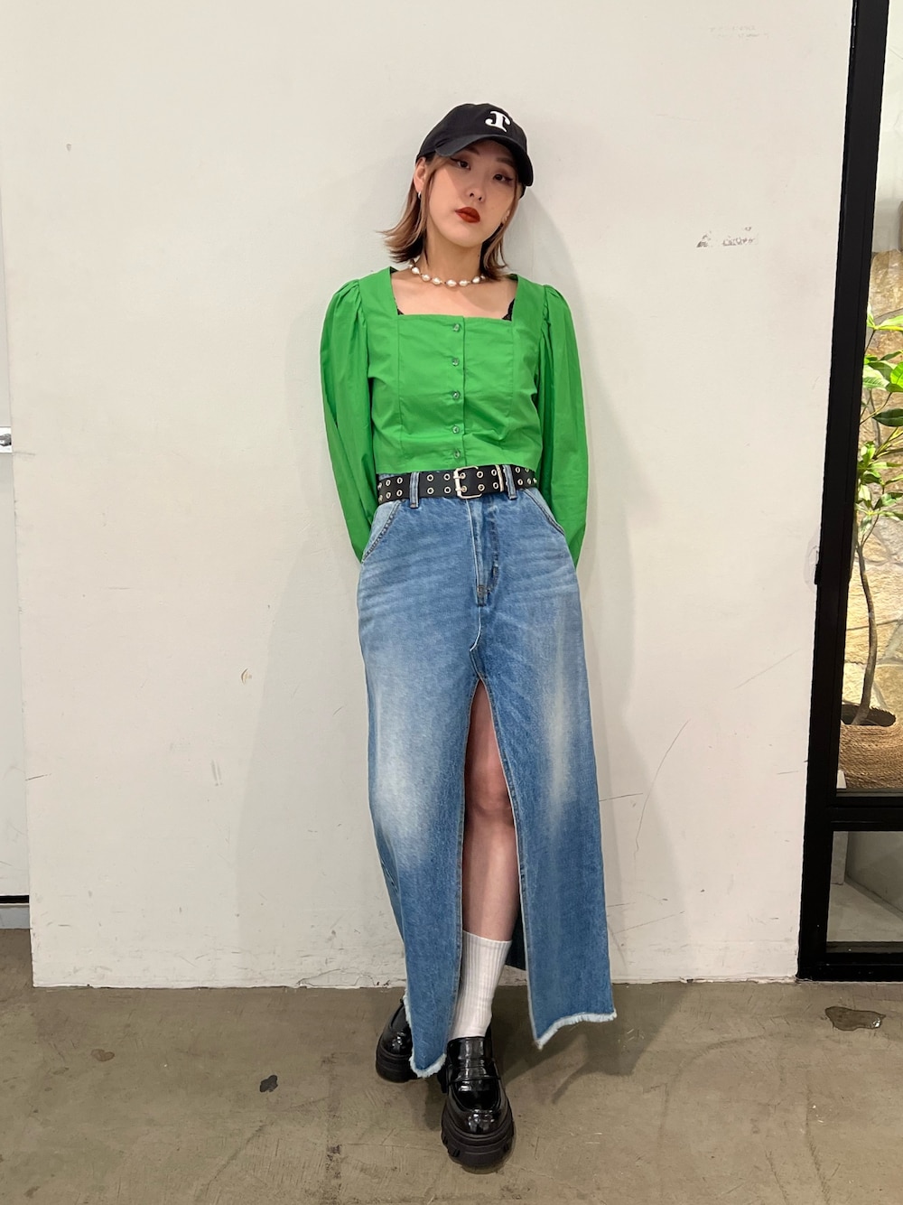 【トップス】 鎖骨が出るので大人ぽく綺麗なシルエットのトップス。 お腹が出る短めの丈なので、ハイウエストボトムと相性抜群です◎ 【ボトム】 深めにスリットが入ってますが、中はショートパンツなのでミニ丈をあまり履かない方でも挑戦していただきやすいです◎ 【シューズ】 厚底ですが軽く高低差が少ないので疲れづらいです◎ 【キャップ】 NEW ERAコラボキャップ! 後ろでサイズ調整ができ、余ったベルトは隠せれます。 シンプルなデザインなのでコーデにプラスしやすいです☺︎