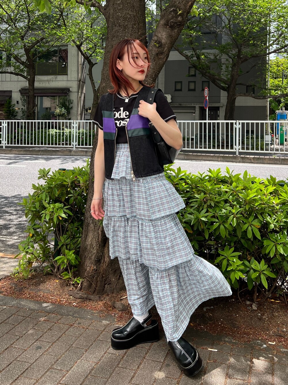 【トップス】 少しタイトめですがピタピタしすぎないTシャツ。シンプルなデザインなのでどのコーデにも合いやすいです◎ 【スカート】 人気のスカートの夏ver.が出ました! 154cmでくるぶしぐらいの丈。 生地感薄手なので涼しく、切りっぱなしではないのでほつれてくる心配もありません。 【ベスト】 デニム×レザーでスポーティーに着られるベスト。 マンネリするコーデのアクセントになります◎