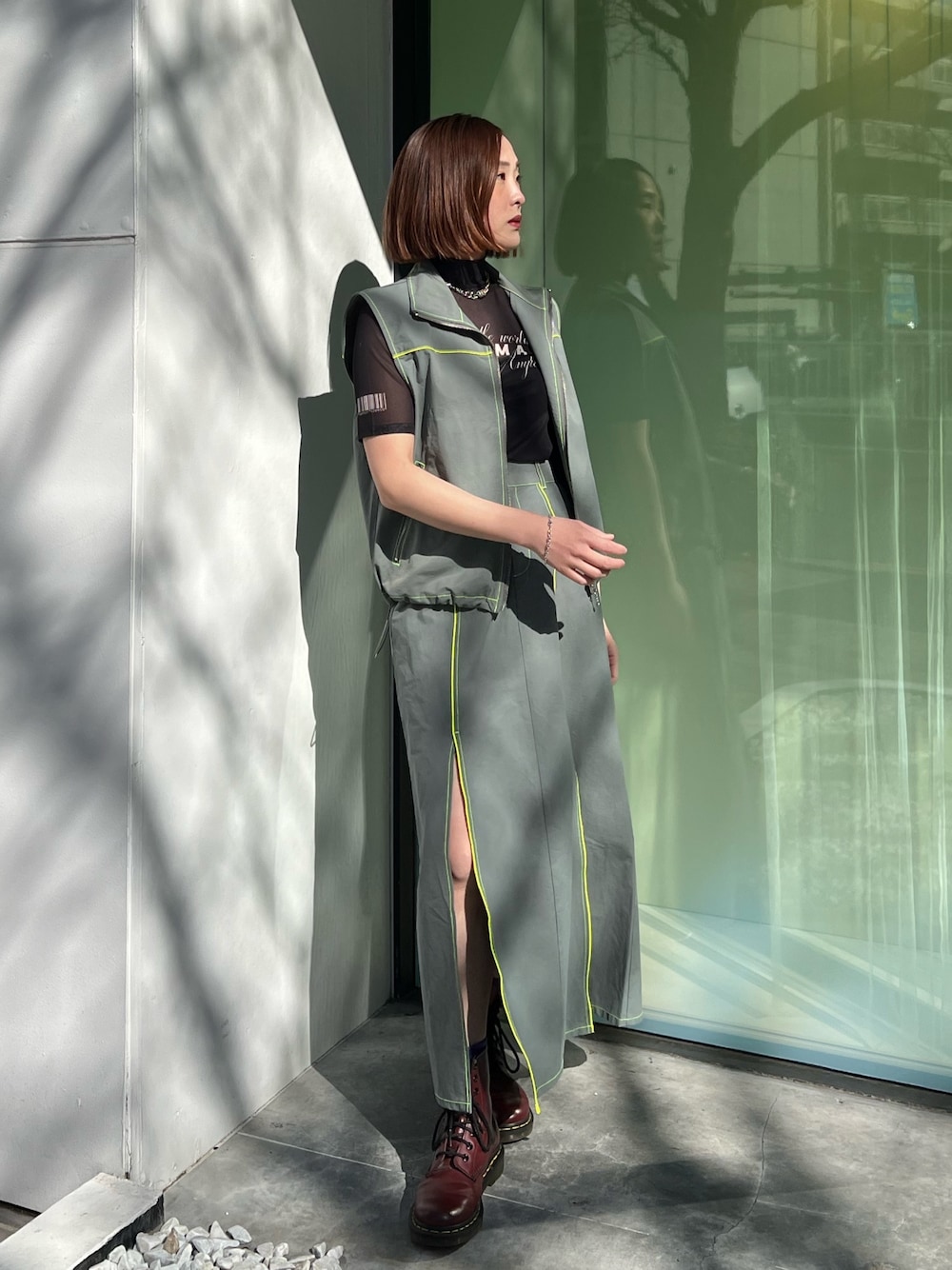 【ベスト】 羽織るだけでスポーティさをプラスできるアイテム! シャカシャカで軽めのナイロン素材で裾のドローコードで絞り調節が可能。 蛍光色のパイピングがアクセント! 【スカート】 ベストと同素材のスカート。 154cmで足首ぐらいの丈。 前2ヶ所と後ろに大胆にスリットが入っており、ヘルシーな肌見せが楽しめます。 ウエストは後ろ部分がゴムなので着脱もラクです! 【トップス】 半袖のシアーインナー。 フロント、バックにロゴが入っているので、カップ付きインナーとの合わせでそのまま1枚の着用が◎