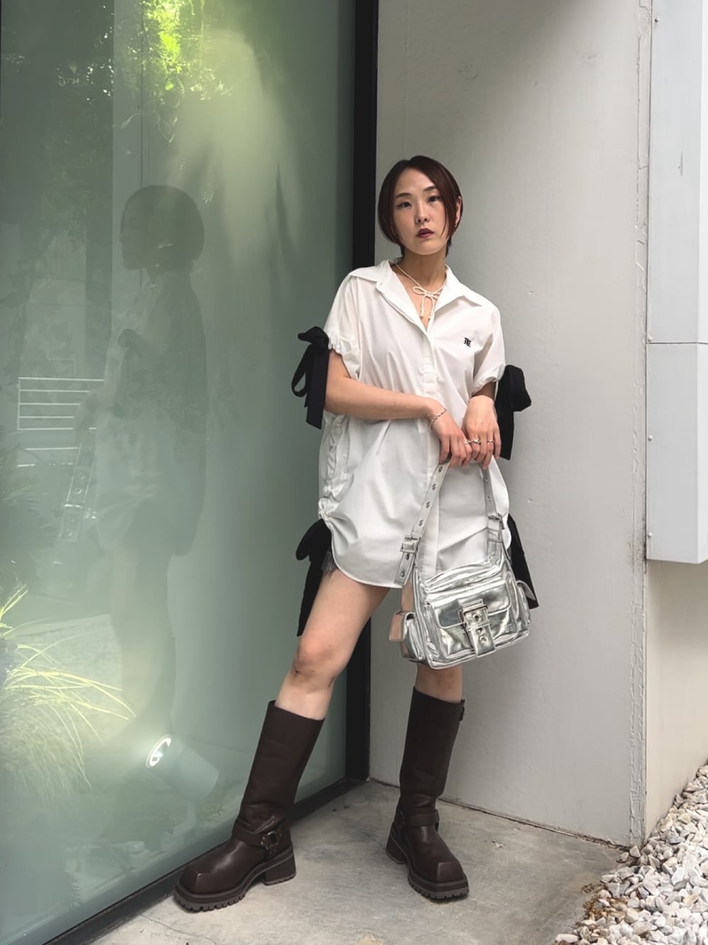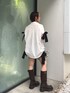 大人クールな印象に☺︎ 【シャツ】 両サイドの大きめリボンはお好みで絞り加減を調節していただけます。 丈感を長めに切る場合は下部分のリボンの絞り加減は緩めがおすすめ◎ ショートボトムでもフレアパンツとの合わせでより大人っぽく着るのも◎ 【ブーツ】 厚底ですが、想像よりは軽いので長時間履く時も疲れづらいです。 綺麗めなコーデに合わせてカジュアルダウンしていただけます。