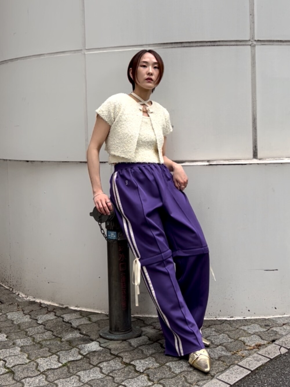 【トップス】 タオル地のような生地感のアンサンブルニットは柔らかく着心地抜群◎ カーデだけでの着用やインナーのタンクだけでの着用ができるので着回し力が高いです☺︎ 【パンツ】 スポーティートレンドのラインジャージパンツ。 リボンディテールでガーリー要素も◎ 膝部分にファスナーがありデザイン変化を楽しめます◎ ①そのまま ②膝部分少しだけ開けて肌見せ ③全て取り外してハーフパンツに変化