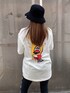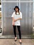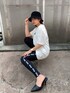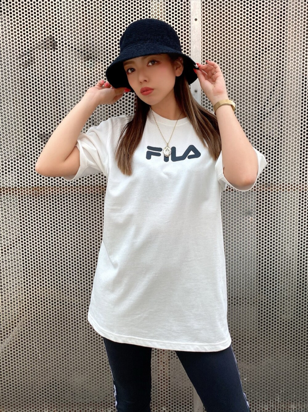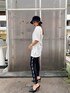 GYDA×FILAコラボ商品です。後ろのデザインは「BUG⁉︎」トレードマークのピエロのお面を被ったキャラクターが大きくデザインされているインパクトがあるTシャツです。長めのデザインなのでスッキリしたボトム、レギンス合わせがおすすめです。私が合わせてるレギンスもFILAコラボ商品でサイドのラインが細見えさせてくれます。少し肉厚なレギンスなので足に沿ってピッタリ着用して頂けます。