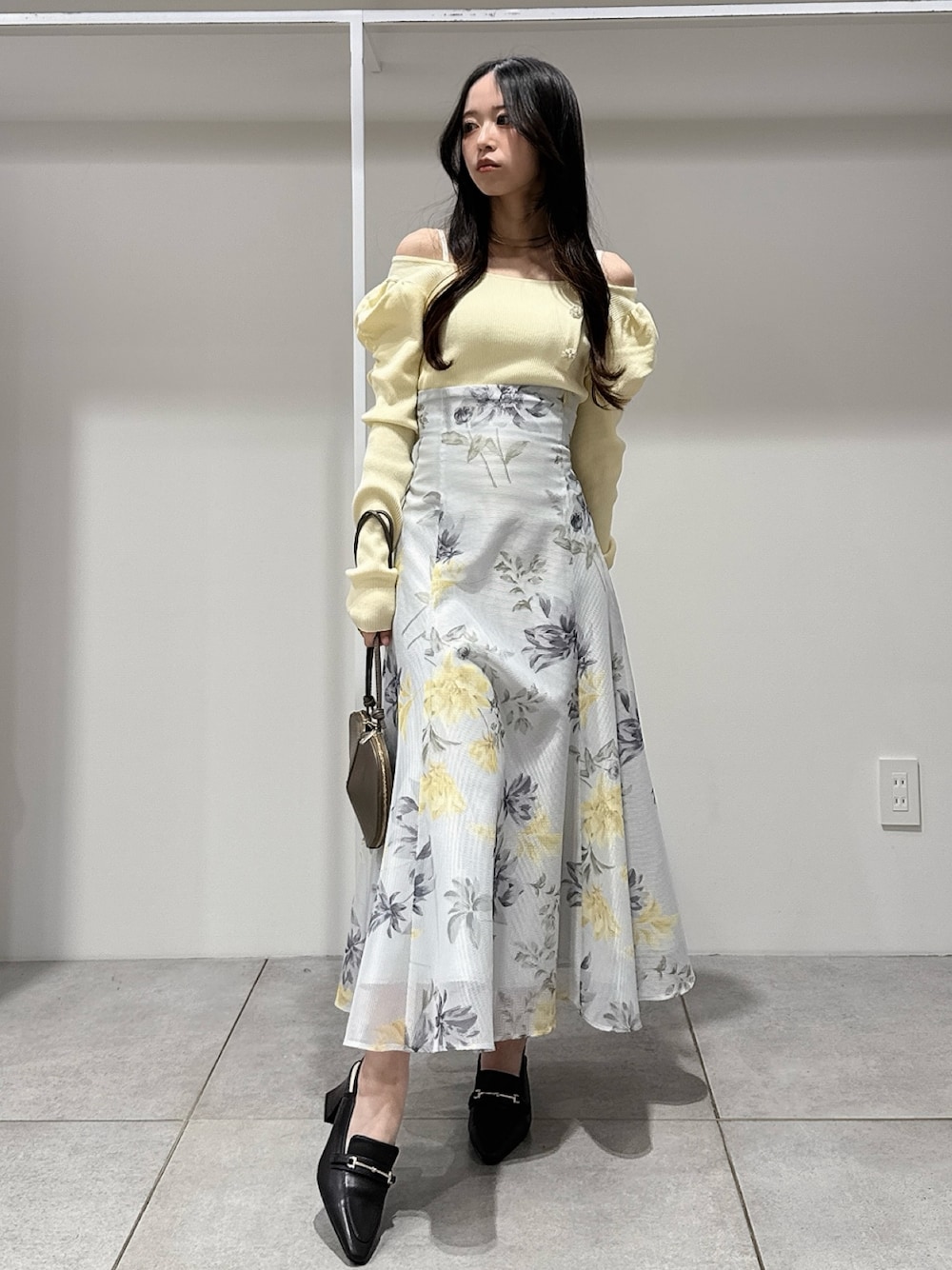 *tops* size:F きらきらビジューボタンがアクセント。 肩を落としてオフショル風にも着られてデコルテスッキリ見えも◎ *skirt* size:S トレンド感のあるメッシュ素材×大花柄で主役級な一枚♡ ハイウエストのコルセットデザインでウエスト調節も効きスタイルアップも叶います♡ *shoes* size:36 春大活躍なミュール。 シュッとしたスクエアトゥのローファーデザインで大人っぽく仕上がります。 太めのスクエアヒールで安定感抜群です☻