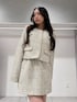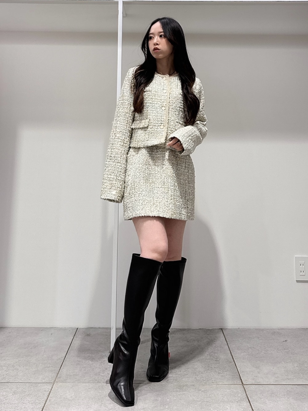 *jacket* size:M 一気に春見えする華やかなツイード。 ミントのカラーはスパンコールも入っていて 動くたびにキラッキラでめちゃくちゃ可愛い生地♡ ショート丈でコーデのバランスとりやすいです◎ *skirt* size:S 足元スッキリ見せてくれる台形ミニ。 スウェットなどカジュアルトップスと合わせてもかわいい♡ *shoes* size:36 ミニ合わせにマストな履くだけで美脚になれるロングブーツ。 長めのスクエアトゥで大人っぽくすっきりした印象に。 太ヒールで安定感もあり疲れを感じにくいです♥
