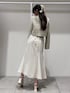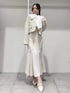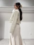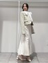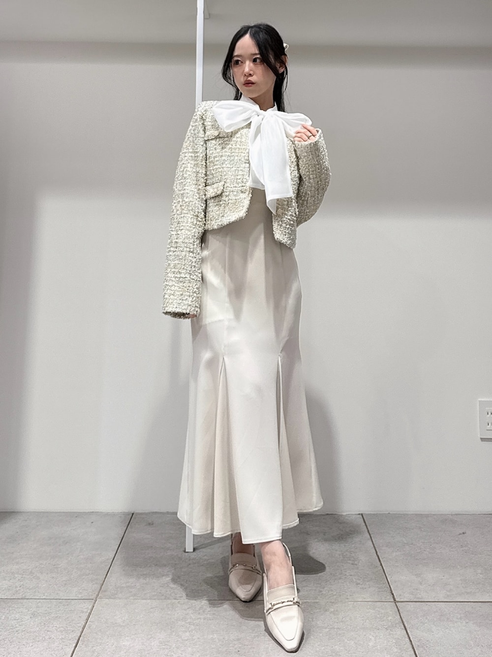 *jacket* size:M 一気に春見えする華やかなツイード。 ミントのカラーはスパンコールも入っていて 動くたびにキラッキラでめちゃくちゃ可愛い生地♡ ショート丈でコーデのバランスとりやすいです◎ *tops* size:Free ハリのあるリボンの華やかなブラウス。 インナー別仕様ではなく裏地付きなのでサッと着れるのも嬉しい◎ お袖のボタンもキラキラしていて細かいところもこだわられてます☻ 単品使いでリボンを主役にしても、 ジャケットやカーデなどと合わせても 胸元のデザインがのぞいて可愛いです♡ *skirt* size:XS マーメイド史上1番綺麗なシルエット🐠♡ バックレースアップでサイズ調節もでき、 ウエストをキュッッッと細く見せてくれます♡ シンプルなマーメイドは持ってて間違いなしな万能アイテムです! *shoes* size:36 春大活躍なミュール。 シュッとしたスクエアトゥのローファーデザインで大人っぽく仕上がります。 太めのスクエアヒールで安定感抜群です☻