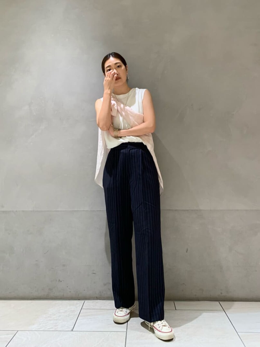 〜大人シャツコーデ〜 【シャツ】大人気のシアーシャツ。普段は選ばないPNKですが最近は手に取ることが多くなってきました☺︎淡いカラーをポイントに、シンプルにまとめてみました! 【パンツ】シルエットが綺麗なこちらも人気のパンツ。今季はストライプのミックスが登場!細身のラインで合わせるだけでさりげなくお洒落にさせてくれる1本。169cmでMサイズ。高身長さんでも短い、、とならないので是非お試し頂きたいです!◎