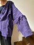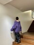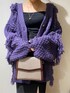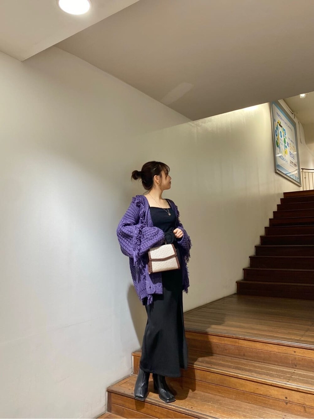 太ももまですっぽり隠れるルーズなサイズ感のシルエットとフリンジが目を惹くニットカーディガンのパープル×ブラックコーデ! ゆるっとしてて楽ちんですし、厚手なのでとっても暖かいです◎