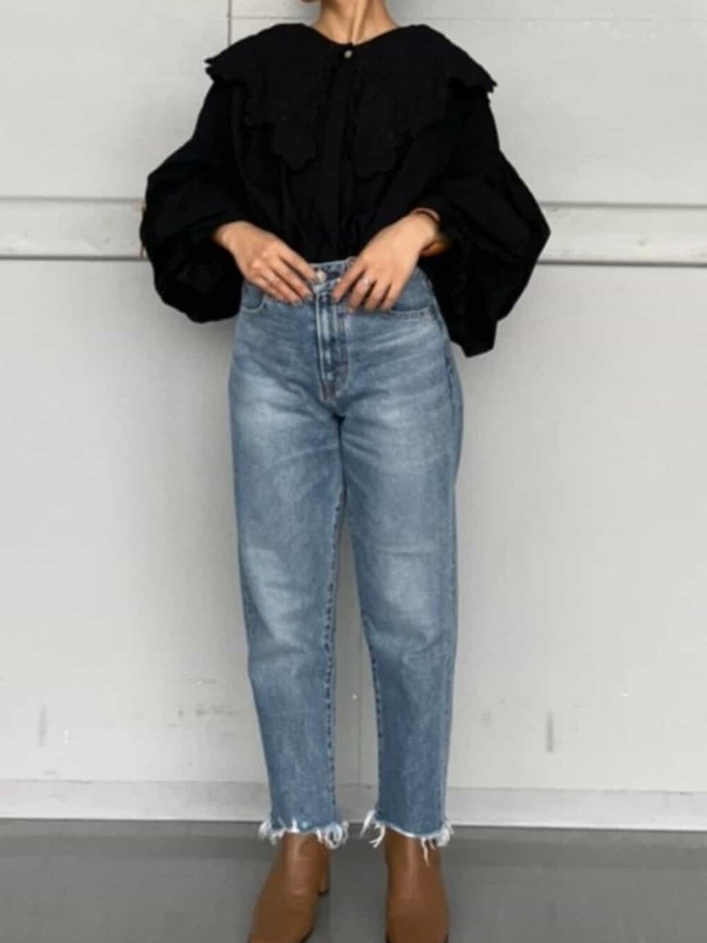 大きめな襟に立体的な刺繍が印象的なシャツは一枚で即トレンド感が演出できおすすめです! デニムは小柄さんでも丈詰無しで着用頂けます!
