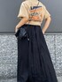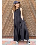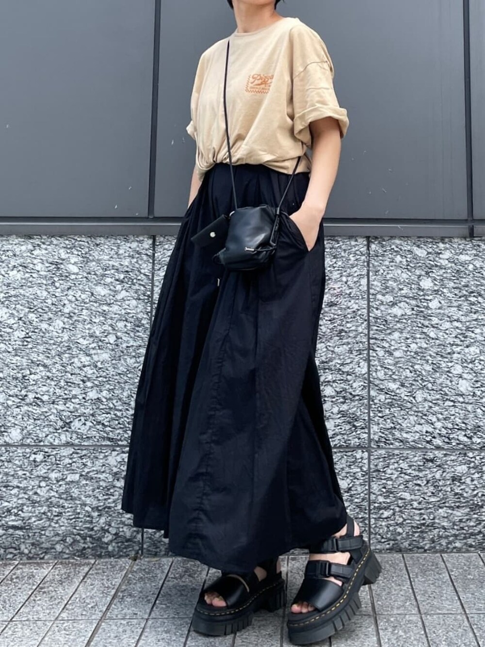 ワンピースの着回しコーデ、メンズライクなサイズ感のTシャツをレイヤードするとスカート見えしてまた新鮮な印象に。こちらのワンピースはイン出来ないのでTシャツの前を直接結んで頂くか、ゴムで結んで内側にくるんと入れるとインしてるように見えます!