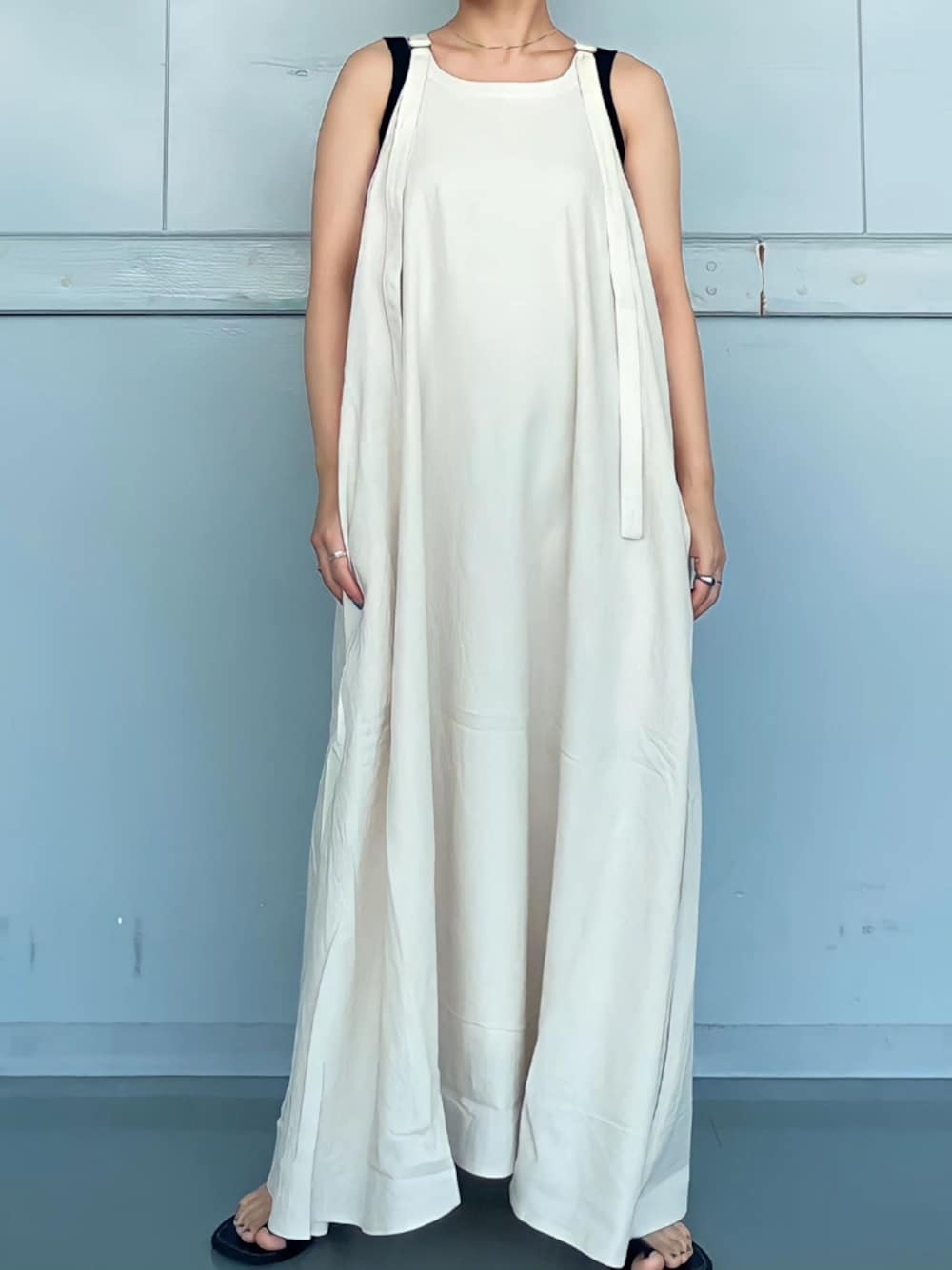 すとんとしたシルエットがかわいいワンピース! 麻混の生地で涼しく歩くたびに揺れるシルエットがかわいいです! ヘルシーにタンク合わせで肌見せするのがおすすめです🫶