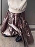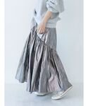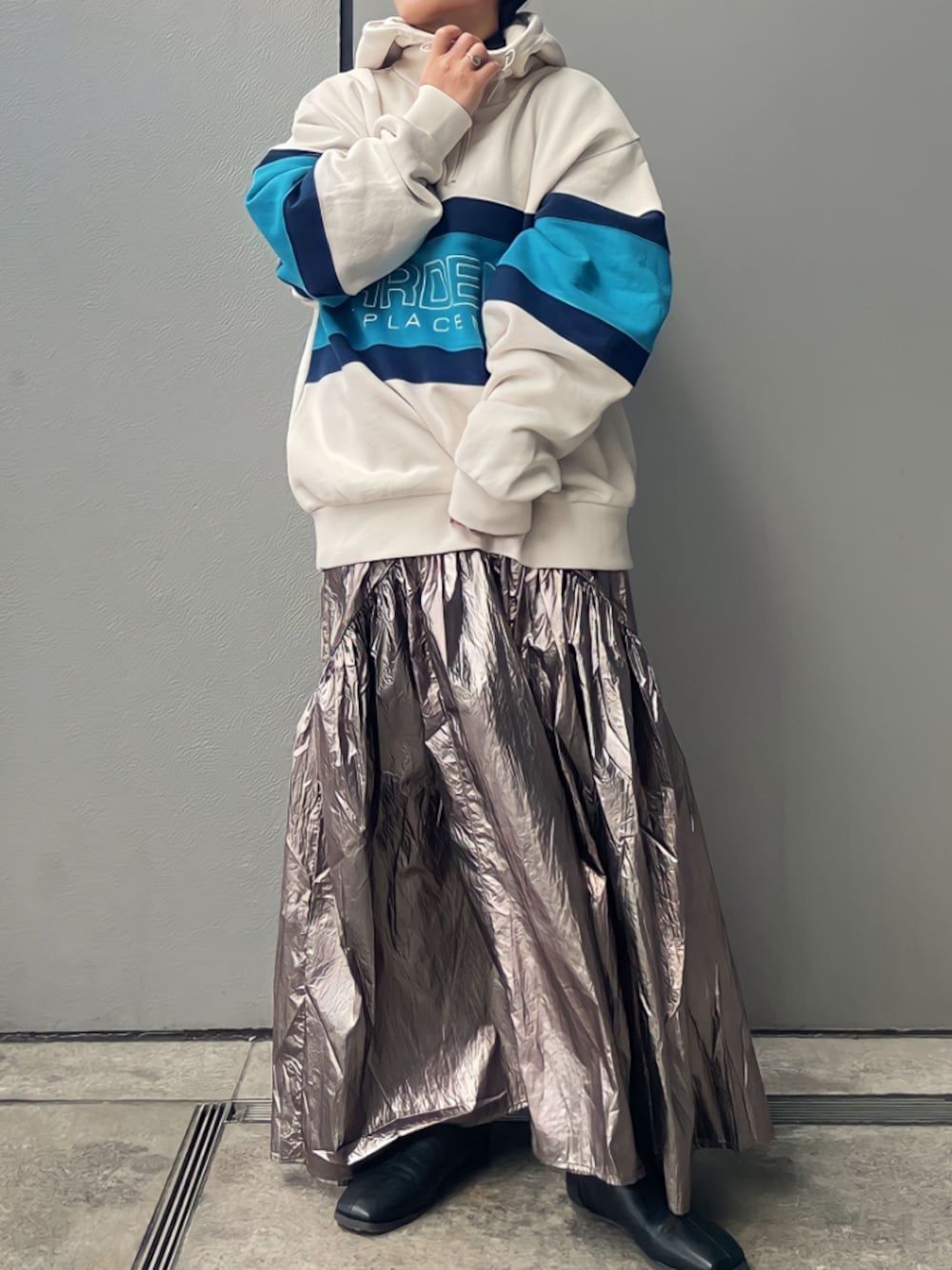 キャッチーなメタリックカラーがかわいい大人気スカートの新色です♡ 折り返さなくてもローヒールで着用でき、既存のギャザースカートよりも薄手で落ち感があります🫶 鉄板のスウェットコーデも今年らしく見える為1枚あると重宝するアイテム🥰💕