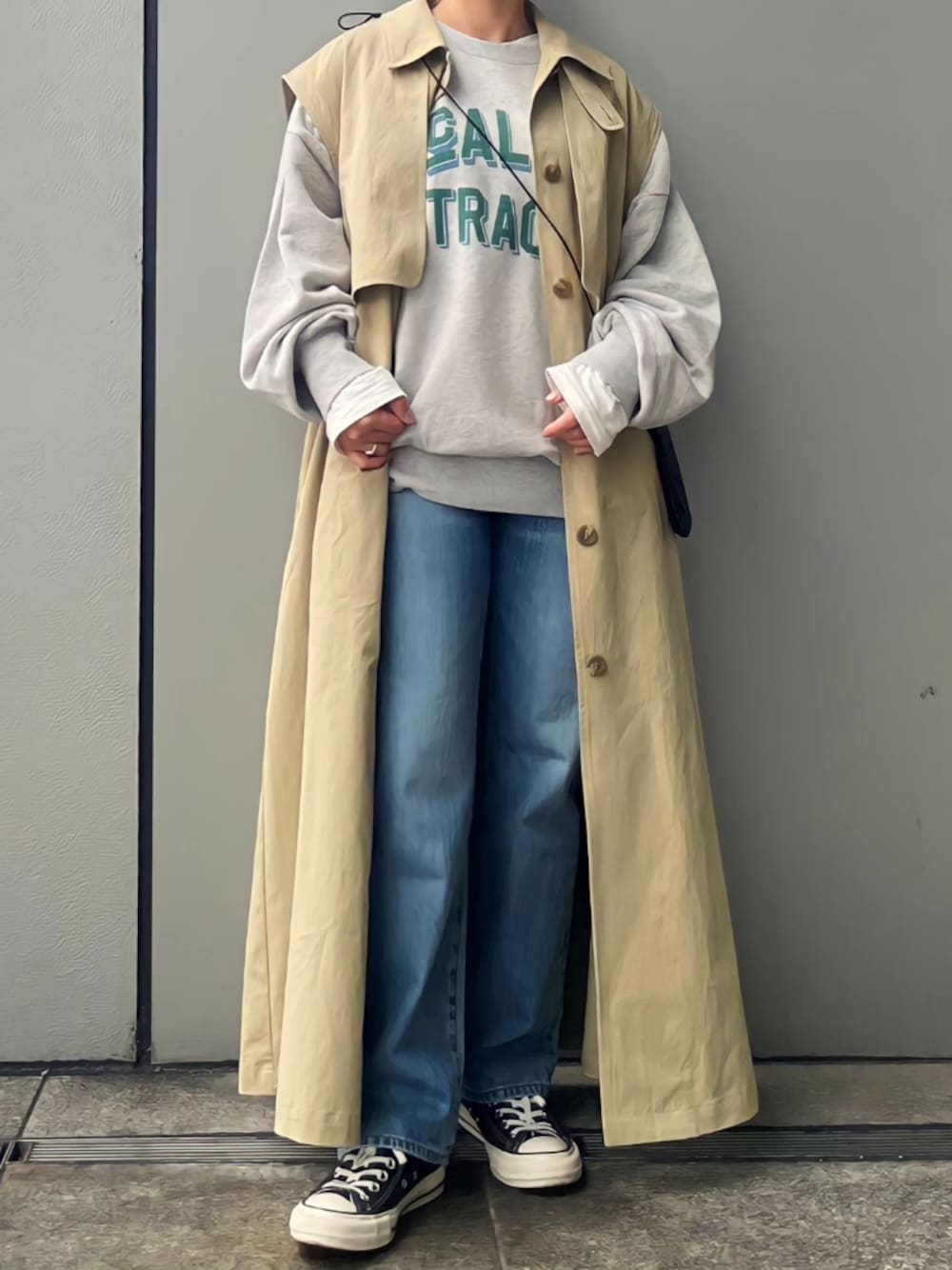 デニムとスウェットの楽ちんコーデだけど羽織るだけで上級者感だしてくれるこのコートほんとに優秀です◎ Ungridのスウェットお袖がたっぷりでかわいいからコートをベストにして着用すると引き立ちます。 長さがしっかりあるのでスタイルアップして見えます🫶