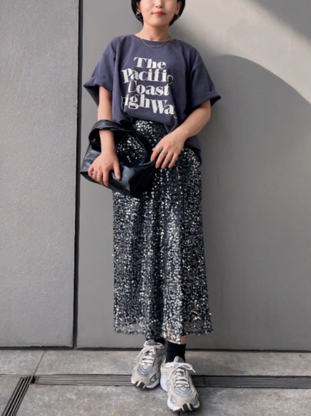 スパンコールスカートで今年らしいTシャツコーデ✨ 店舗でも大人気なTシャツはヴンテージライクなカラーとゆるっとラフに着用出来るシルエットが好評です♡ スカートは総ゴムなのでとっても楽に着用できました! 着丈も短めで抜け感がでます!