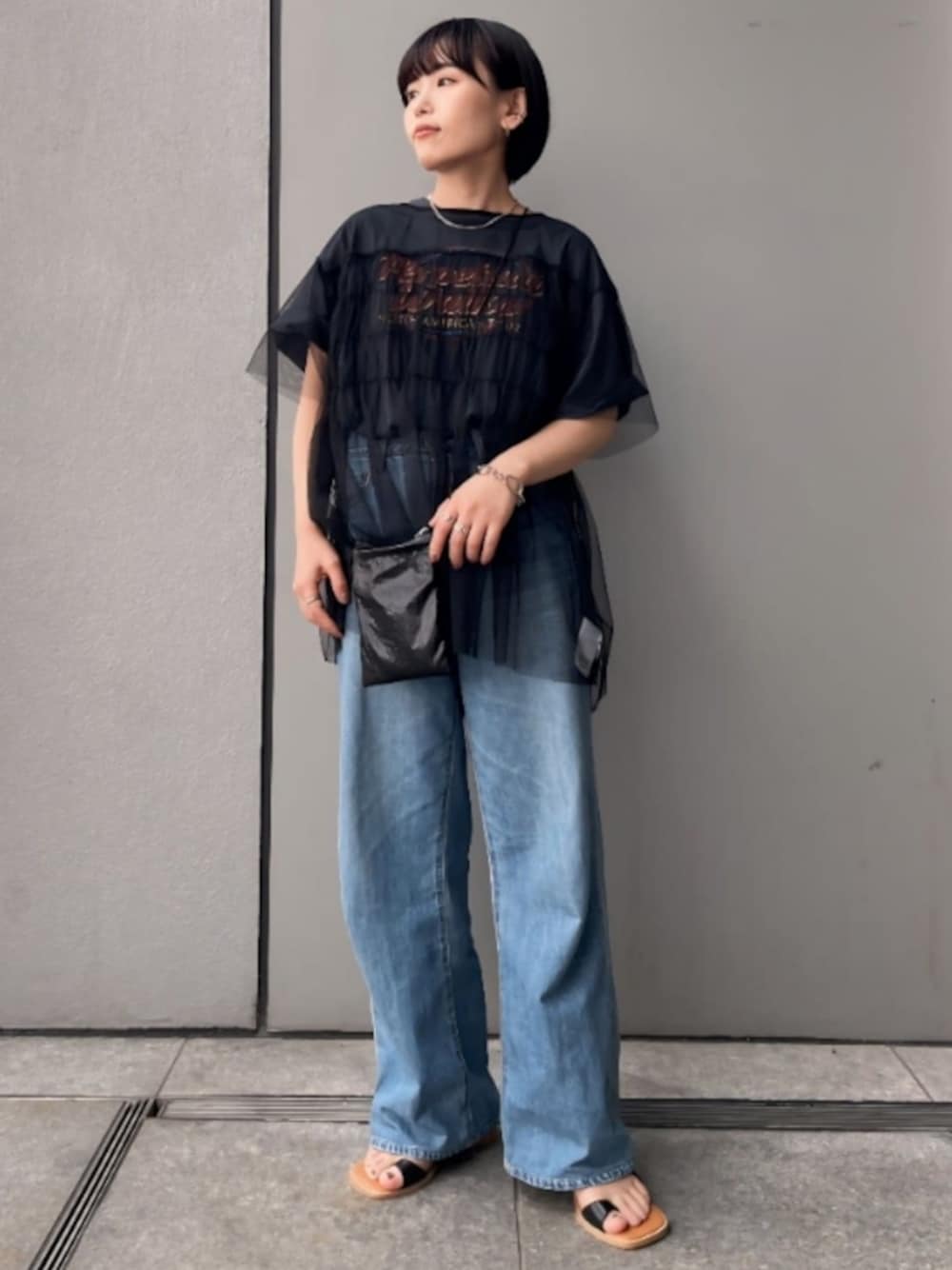 いつものTシャツ×デニムコーデにプラスするだけでオシャレ見えするチュールトップス♡ Tシャツはもちろんワンピースやタンクとレイヤードするのもおすすめです! デニムは夏も快適な柔らかなは着心地で人気のルーズデニムです! 着丈長めなので私は股下67cmに裾上げしています☺️🤝