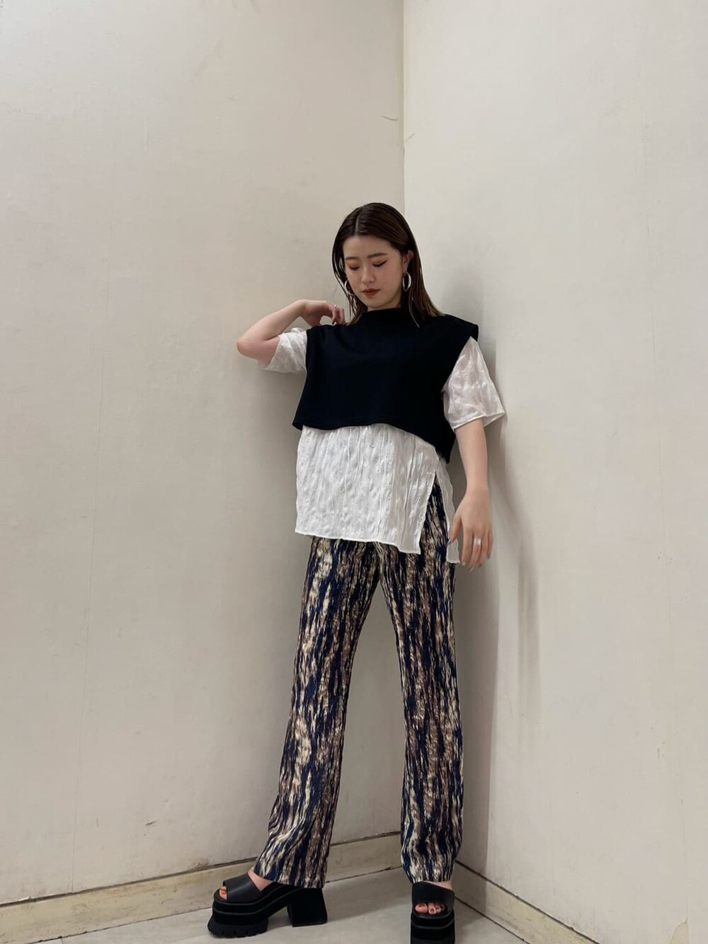 レイヤード風のデザイントップス❤︎ シャツの部分がシワ加工になっていることで他とは一味違うモードな印象をプラスしてくれます!またサラッとした生地感のシャツなのでTシャツを着たような楽ちんな着心地なとこも嬉しい◎丈感は腰回りまで隠れる長めですがサイドにはスリットが入っているので着用した際に立体感が出てスッキリと見せてくれます!さらに横から見たときも太ももやお尻をさりげなくカバーしてくれます!細身のボトムやタイトスカートとの相性が抜群です❤︎ 私が合わせているのは存在感のあるEMODAオリジナル柄を使用したハイウエストパンツを履いてみました!ハイウエストで腰位置を高めに見せてくれるところと縦のラインが綺麗にみえる柄なので脚長効果の期待出来る美脚パンツです❤︎ショート丈のトップスと合わせても可愛いですね!ぜひチェックしてみてください❤︎