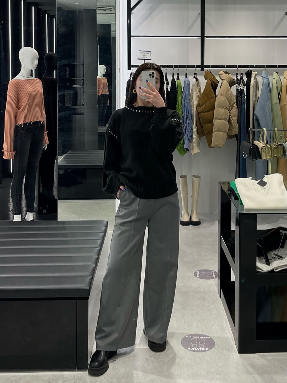 ステッチデザインがかわいいニットはふんわり軽くて着やすさ◎です!ゆったり目なオーバーシルエットで165㎝の私が着ても腰回りをカバーしてくれます!シンプルなコーデにもこのステッチデザインがアクセントを加えてくれます❤︎ ボトムスはミニスカートで女性らしく合わせてもかわいいです!私はゆるっとしたシルエットのパンツを合わせて大人っぽコーデにしました! このパンツはワイドシルエットですがセンタープレスを施していることでスラッとスマートに見せてくますしカジュアルダウンしすぎないように仕上げてくれます!是非Checkして見てください❤︎