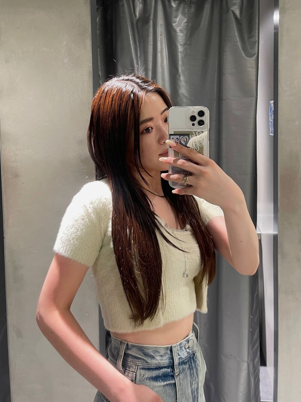 女性らしさ◎なシャギーニット❤︎ コンパクトなサイズ感ですが伸縮性と柔らかいニットなので着心地良いです! フロントのeマークのチェーンがポイントになって可愛いです❤︎長さ調節と取り外しが可能です! 中のインナーだけでも使えるので長い時期での着用が出来ます!