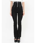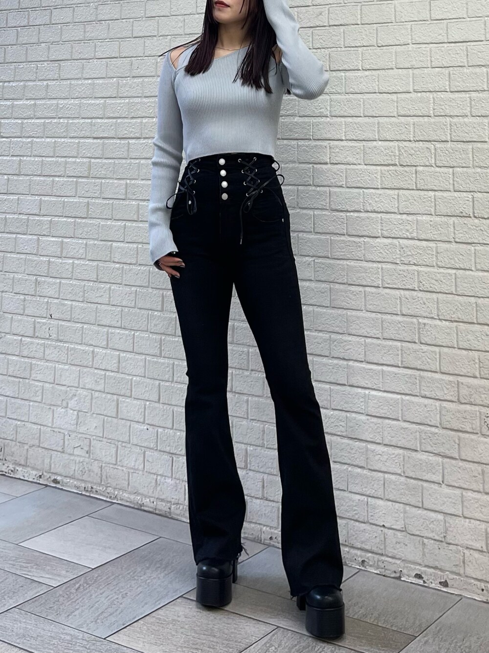 レースアップデザインがポイントのデニム❤︎ ハイウエストとフレアシルエットで脚長効果抜群です!程よい引き締め効果と補正感があるので太もも周りと骨盤周りが細く見せてくれます! シンプルなトップス合わせてもこのデニム履けば一気に映えること間違えなしです❤︎