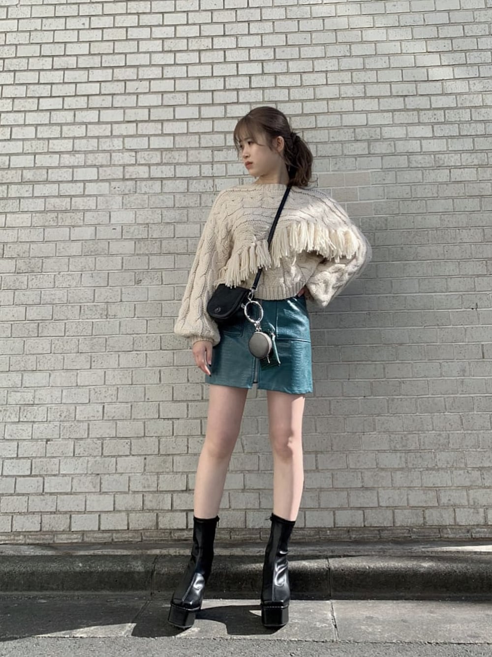 【ブルーのレザースカートでエッジの効いたEVRISコーデ】 ニット▷去年も人気だったフリンジニットが再登場! とにかくボリューム感が可愛いニットです! 今年はおへそ下くらいのスッキリ丈なのでボトムス合わせもしやすくなっています! フリンジが胸下に斜めに入っているので顔まわりはスッキリした印象に! スカート▷クロコ柄のレザースカートなのでシンプルなトップスやアウターでもこなれ感が出るアイテムです! 安心して履けるインナーパンツ付きです! ブーツ▷足首にフィットしてくれるブーツなのでより足をスッキリ見せれる+脚長効果も抜群のアイテムです! ヒールは10センチくらいありますが傾斜が少なく疲れにくいです! 厚底ブーツですがすっきりとしたスクエアとヒールでゴツくなりすぎないのも嬉しいポイント! バック▷今トレンドのミニショルダーバックです! イヤフォンや充電器、リップなどの必要最低限の荷物でお出かけできる優れものです!