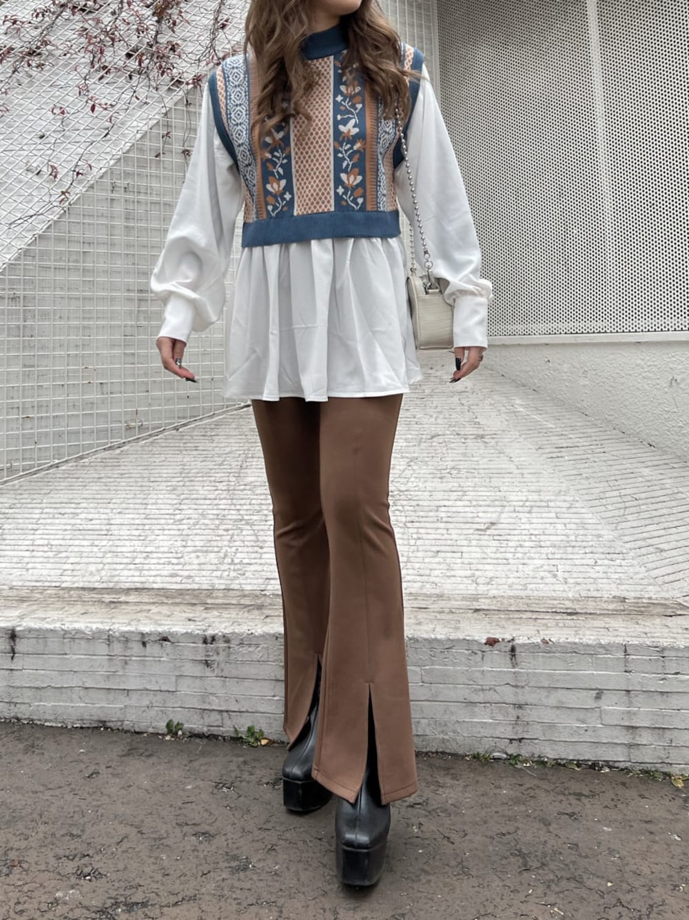 【オリジナル柄のシャツニットコーデ】 【シャツ】 EVRISらしいジャガードのニットにシャツがドッキングされているアイテム! シャツは柔らかい素材なので落ち感がありふわっとしたシルエットがカジュアルすぎない印象に! 丈感は162センチの私でもお尻がすっぽり隠れるのでワンピース風に着たり、フレアパンツ合わせでも◎ 着回し抜群のアイテムなので今の時期でも春先でもご使用頂けやすいです! 【パンツ】 EVRISで人気のフレアパンツ! 前にスリットが入ってるのでブーツやスニーカー合わせでも可愛く着こなせます! 膝上からフレアになっているのと太ももとフレアの部分のメリハリがしっかりあるので脚長効果も! オールシーズン着用して頂けやすい素材感になっています! 【バック】 1番人気のこのバックはボールチェーンと別でショルダー紐がついてるので2WAYでご使用可能! コンパクトなサイズ感ですがチャックが二つあり荷物を分けて頂けるので使い勝手の良いアイテムです!