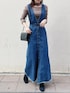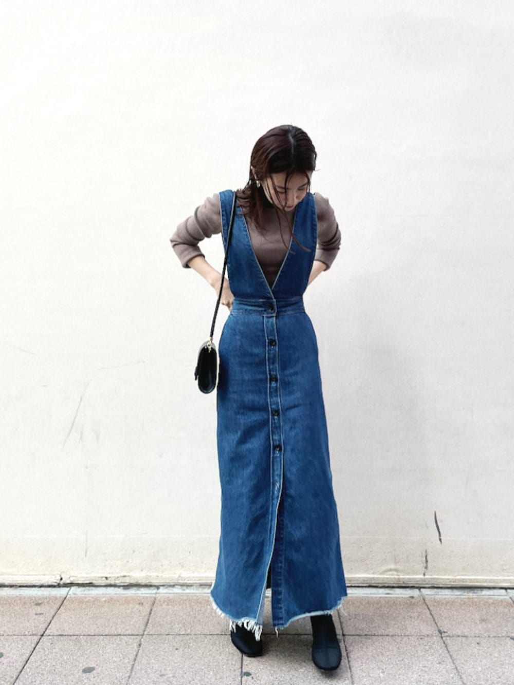 Aラインシルエットのジャンパースカート。アイボリー・ベージュはカツラギ、ブルーはデニムでお作りしています。トレンドのジャンパースカートはカジュアルな素材でDailyに使いやすく、秋冬はリブニット合わせや、重ね着で厚手のゆるニットやパーカー、春夏はTシャツ、ノースリーブ合わせがマスト◎ 腰からの落ち感がとても綺麗なので、デニムでも大きく見えないのがポイント。インナーを変えるだけでがらりと変わる雰囲気をお楽しみください♡