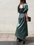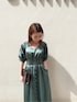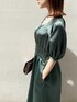 パッと目を惹く光沢感が華やかなドレス○。ボレロを羽織っているようなボリュームスリーブデザインが気になる二の上をばっちりカバーしてくれるポイント。さりげない背中見せのデザインで、後ろ姿も女性らしさのたっぷりの美しい一着です。ウエストがSで68cmとラグナムーンのドレスラインでは、結構ゆとりのあるサイズ。グリーンは渋めなビビットカラーなので、個性派の方にオススメ。一緒に合わせているバックは長財布とお祝儀袋がすっぽり入るサイズで大容量↑。鋭いラメ感がモダンな雰囲気を出してくれるドレスをより華やかにしてくれるBAGです。