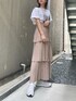 【LIFE】 アメリカ合衆国で発行されていた雑誌との、コラボTシャツ。シンプルで、どんなボトムスを合わせてもこなれ感がでるオシャレな1枚。女性がプリントされているバージョンと、犬がプリントされているバージョンがあるのですが個人的に犬が大好きなので私は犬バージョンを選びました↑。もちっとした素材で、白だけど透けにくいのが特徴。友達とカフェテイクアウトしながらお散歩をイメージして、ラフだけど手抜き感のないスタイリングに◎ ティアードスカートはブルーとベージュ2色リアル購入!シャリ感のある素材で、3段フリルになっていることによって視覚効果で足が長く見え腰周りのカバー力もすごいあります。身長問わず履いていただけるので是非チェックしてみてください。