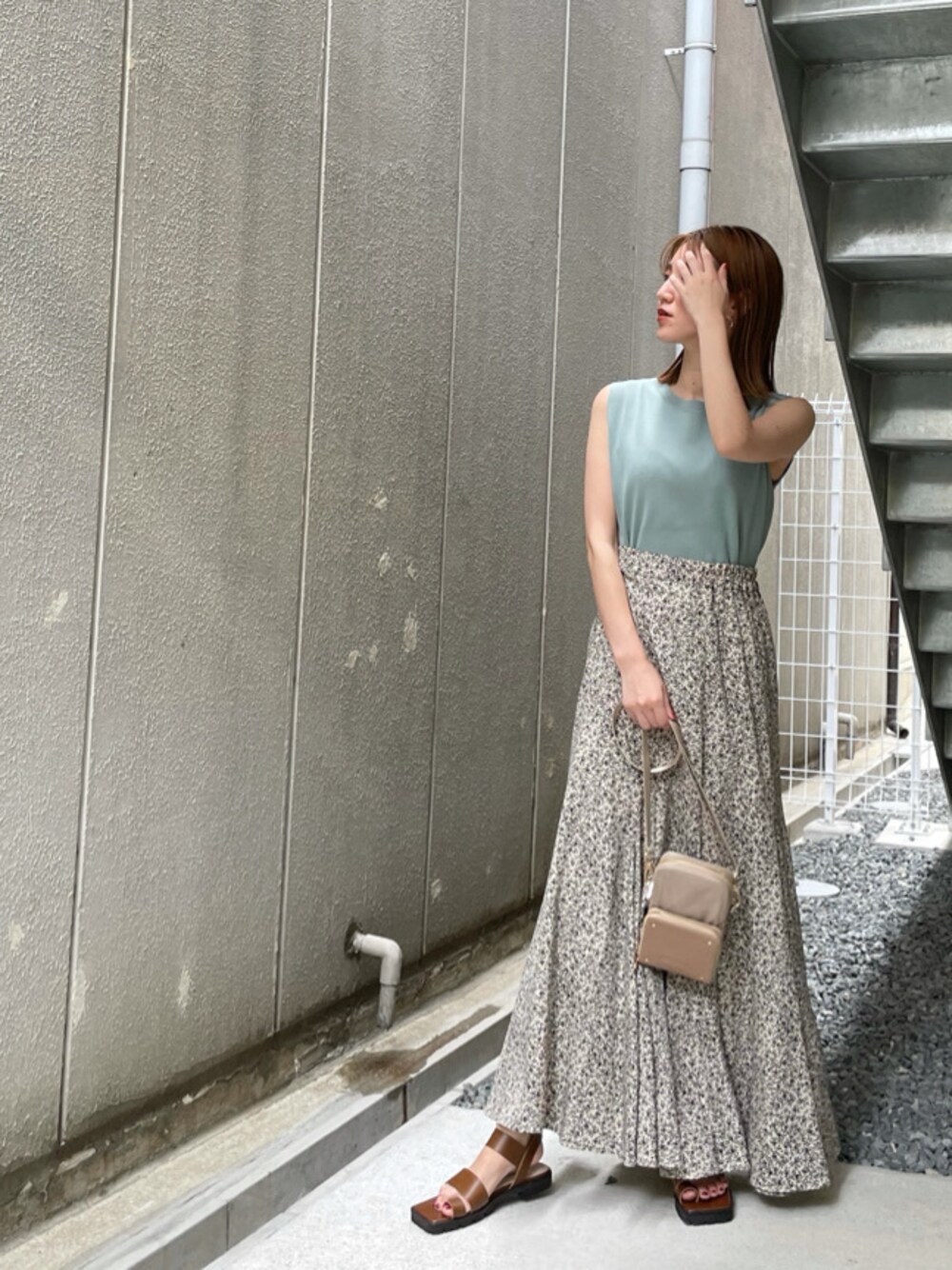 カラーで遊ぶ、カジュアルきれいめミックスコーデ。【トップス】LAGUNAMOON定番アイテム、ミニマルトップス◎ 全スタッフ持ってるんじゃないか?というくらいスタッフからも大人気。夏になればみんな着るので、スタッフの中では '' 夏のユニホーム'' と呼ばれています。そして、腕が細く見えるよう袖のラインを仕立てているのでノースリーブが苦手なお客さまも安心してきていただけるかな?と思います○【スカート】これまでとチラッとご紹介していたフラワースカート。ちいさなフラワー柄がLAGUNAMOONらしいデザイン。 【サンダル】存在感のあるボリュームソールを使用したサンダル。カジュアルになるかな?とあまり履いたことがなかったのですが、履いてびっくり。どんなスタイリングでも合う!足首のバックルデザインが足を固定してくれるので安心して履いていただけます。