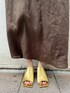 夏にピッタリの【リネンワンピース】。天然素材なので、化学繊維と比べると蒸れにくく通気性抜群 ◎ 中でもリネンはやわらかい肌触りでベタつきにくいので暑い季節にはぴったりです!ボタンを外すと生地たっぷりのボリューム感あるシルエットに変わるのでその日の気分で雰囲気をお楽しみください。【サンダル】私の大好きなカラーサンダル。目をひくビビットカラーのサテンが洋服に負けない主役になってくれるのでサンダル難民、カラー好きの方には是非手にとっていただきたいアイテムです!