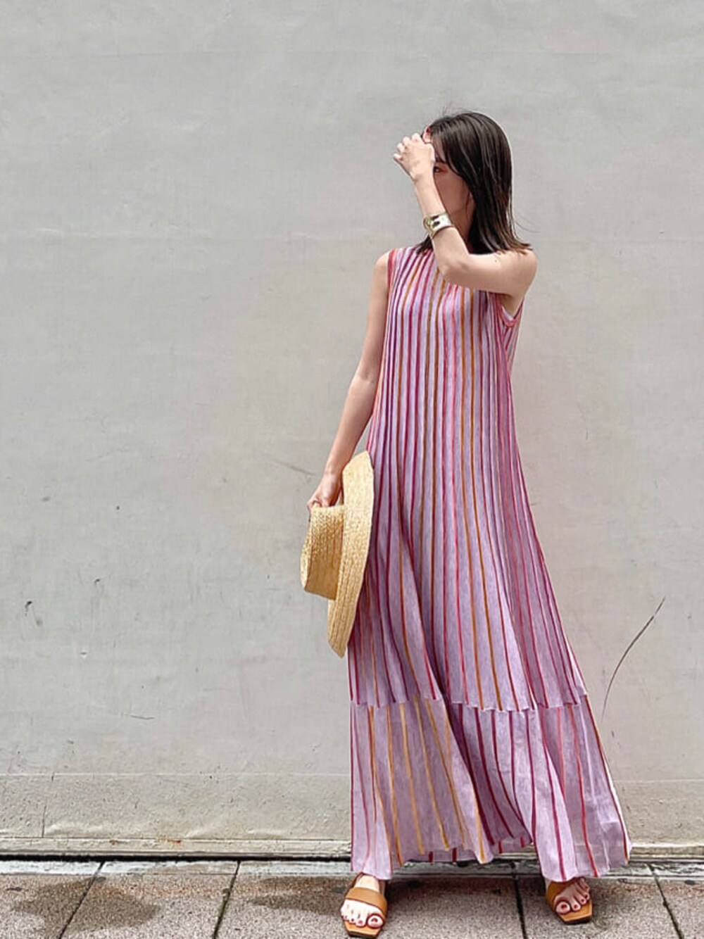WEB予約圧倒的人気。【ワンピース】グラデーションになっているレインボーカラーの糸がアクセントのニットワンピース◎ 動くたび軽やかに揺れるシアー素材ニットは、角度、光の当たりによって印象が変わります!今回私は飛びきり映えるパープルを選びました。ノーマルカメラフィルターでこのラメ感。154cm、フラットシューズでも擦らなかったので小柄な方にもオススメのワンピースです。一緒に合わせている【ハット】洋服はノースリーブでOKだけど、顔は日焼けしたくない方続出!私のその中のひとりです。唾が大きめなので顔がすっぽり隠れ、日焼け対策になるハット○ 是非チェックしてください!