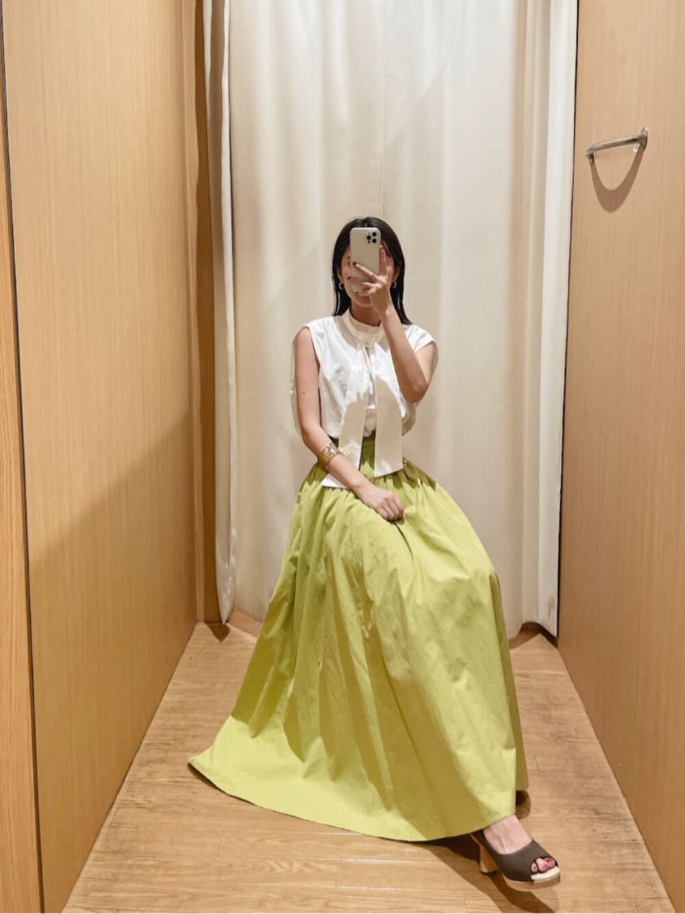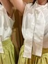 コットンのハリ感のある素材感が大人カワイイブラウスとスカートのセットアップ。【トップス】ボウタイは取り外し可能◎ 長めのボウタイなので、リボンにしたりネクタイ風にしたり、結び方は自分らしくアレンジ出来ます。私はスカートが甘さを出しているのでリボンにせずに固結びにしました。タックショルダーデザインなので前から、そして横から見た時に二の腕をさりげなくカバーしてくれるのでノースリーブでも着やすい1着に。店舗ではリモート映えするブラウスとして人気です。【スカート】贅沢ボリュームのスカートは、コットン100%でパキっとした仕上がりになっています。正直腰周り大きく見えないかな?と不安だったのですが、ボリュームがあるのにびっくりするほど落ち感があるので大きく見えませんでした!これには履いて感動。。。【サンダル】ラグナムーン定番のオープントゥサンダル。どんなスタイルにも合い、足元をバシ!と決めてくれるのでクローゼットに1足あると安心ですよ。ふわふわのクッションが入ったソールなので高さはありますが疲れにくいつくりとなっております。