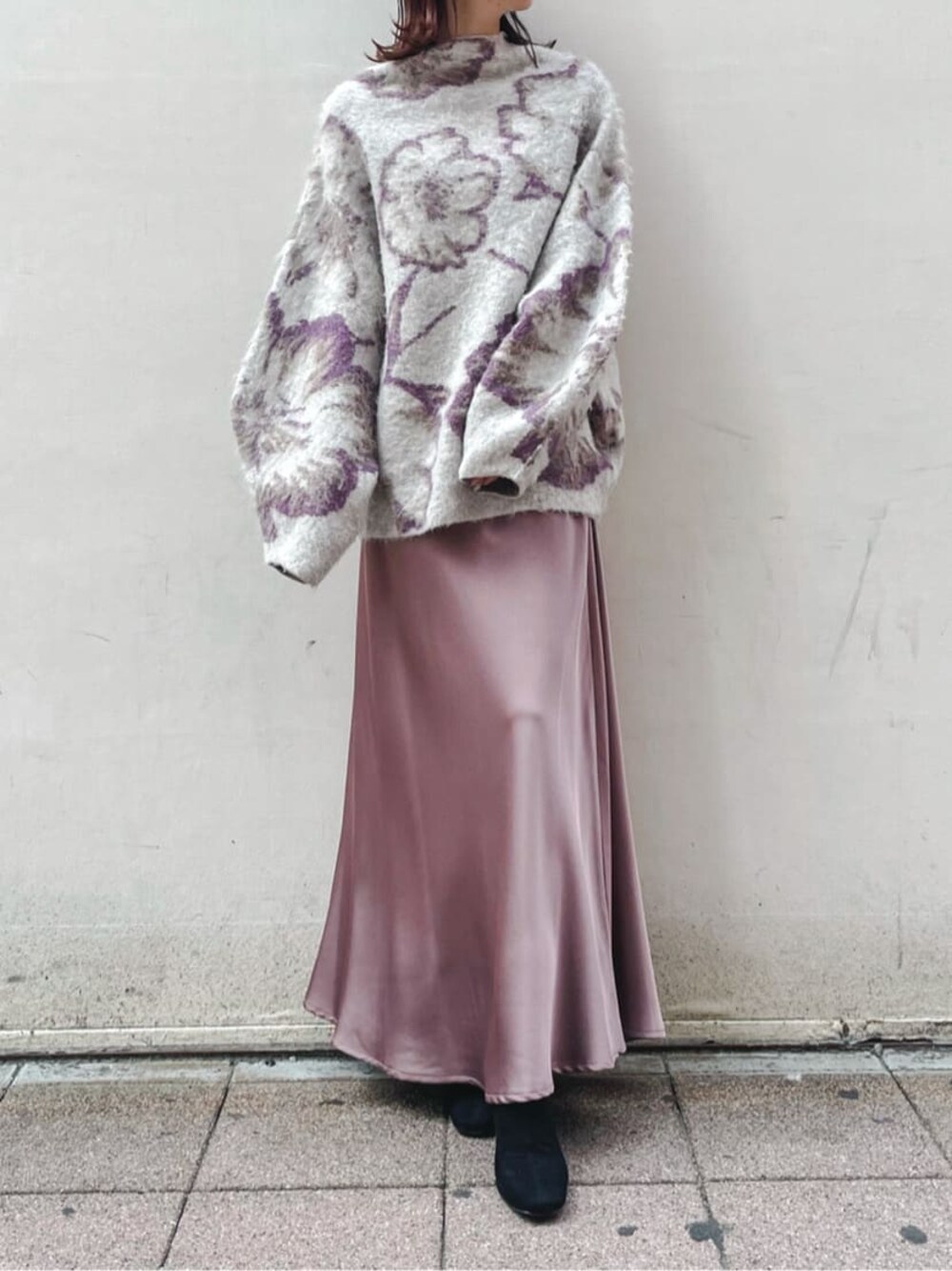 パープルで統一感をだしたスタイリング○。WEBカタログでNikiさんが着用してくださっている大胆なフラワーパターンデザインが目を引く 《ニット》。この柄が本当に可愛くて、ルーズだけど女性らしさを忘れない、拘りぬいたフォルムがLAGUNAMOONらしくて大好きです。起毛なのでふわふわ柔らかい着心地で、首元がボトルネックデザインなので顔まわりスッキリ・小顔見えします◎ 全色着てみましたが、どれも印象が変わり、とてもステキなのでみなさんが悩まれる理由がわかります。。。《スカート》オールシーズン履くことができ、衣替えの必要がないので大好きです。Tシャツ・ピタッとニット・ブラウス・トレーナー・基本的になんでも組み合わせができます!◎ 私は今回ゆるっと合わせたので、足元はピンヒールタイプの《ブーツ》毎度おなじみのスエードブーツ。合皮・本革を履いた時の足首のブーツ跡に悩まれてる方はぜひスエードブーツをお試しください。