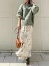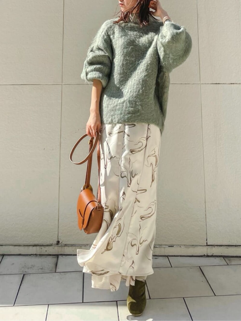 お店のなかでも一際目をひく 《シャギーフォルムニット》カラー展開がとても可愛いので、悩まれる方が続出!わたしは2色買いしたスエードブーツのカーキをお洒落に着こなしかったので、同系色のミントグリーンを選びました◎ こっくりとした暗い色みな多くなりがちな秋冬。カラーで気持ちも見た目も、明るくフレッシュにいくのはいかがでしょうか?? 《スカート》マーブル柄がポイントのスカート。ニュアンス感があって、このスカートを履くだけで″ こなれ感 ″ がでるきがして、スタイリングに迷ったらいつもこのスカートを選びます。154cmのわたしでブーツ履いてちょうど良い丈でした!ぺたんこのバレエシューズを履くならウエストを2回ほどおって、トップスをだしてきると良いです〇。 ①ミニボトムス×ロングブーツ ②デニム×スニーカー ③ ワイドパンツ×ショートブーツ どのテイストにも合わせやすいニット。履くだけで″こなれ感″がでるスカート。ぜひチェックなさってください!