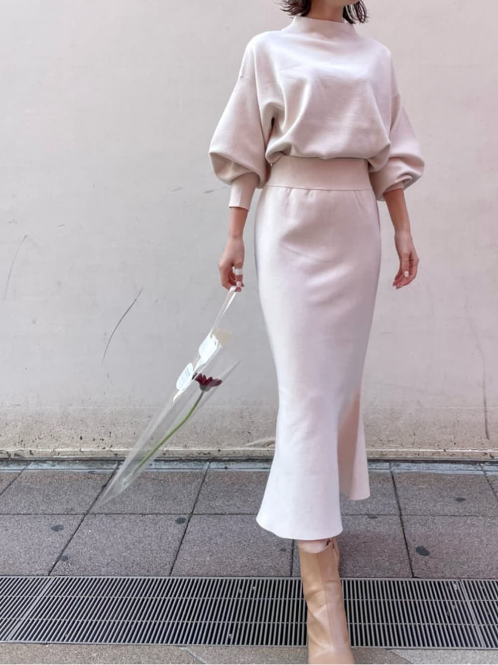 ″オトナが楽しめる″ セットアップ。私は新色のアイボリーをワンピースのように色を揃えて着ました。こちらのセットアップはLAGUNAMOONの毛玉知らず、型崩れ知らずで有名な定番アイテム。 【トップス】首元がボトルネックデザインになっているので締め付け感0。首元部分が縦に立ち上がっているのでハイネックが苦手な方でも挑戦していただきやすいデザインです〇。一緒に合わせいる【スカート】は伸縮性があるので、苦しくなく、店舗ではデスクワークをされている方に大人気。制服かのように毎日着てしまうと、OLさんに好評です。シャリ感のある素材のマーメイドシルエットのスカートはブーツはもちろん、スニーカー合わせもすごく可愛いです。アイボリーとライトグレーの色の違いが伝わりにくいので横に並べました。8枚目、左側がライトグレーです。【コート】イタリア製のウールを使用。驚くほどに軽いです。ウールをこんなに贅沢に使用しているのにこの軽さが叶うのがラグナムーンだなと思いました。腕のアームが広いのでニットをもたつくことなく羽織れます。ぜひチェックなさってください!