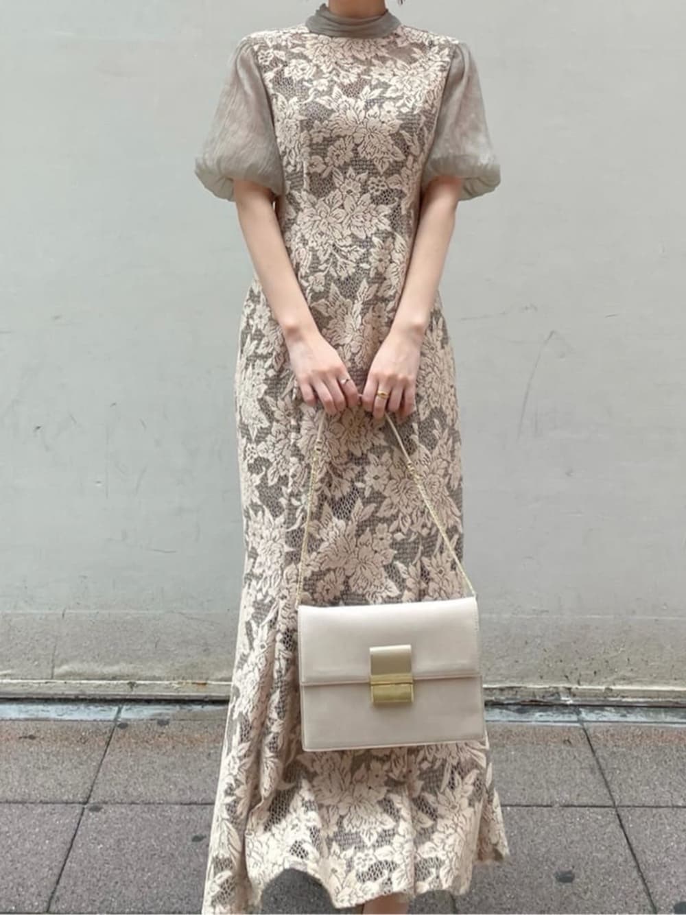 オーダーが殺到した ''エレガントと、ヴィンテージを組み合わせたLAGUNAMOONオリジナルドレス'' 〈DRESS〉クラフトな雰囲気のレースが特徴のレースが目をひく一着。お袖部分はほんのりやさしいシアーで上品さをプラス。今はタイトという形とおなじように主流になっている''マーメイド''。女性らしさが叶い、骨格・体型問わずスレンダーにみせてくれるので大好きなシルエットです。今回私は全体を同系色でまとめたヌーディなオトナスタイルに。154cmウエスト62cmSサイズでウエストしっかりゆとりあり。丈感は7cmヒールでちょうどよかったです◎。〈BAG・SHOES〉なんとなく手を抜いてしまいがちなバック・シューズ。このふたつを拘ることでドレスがさらに高見えし、どこからみても完璧な仕上がりになるので、是非小物も一緒にチェックなさってください。