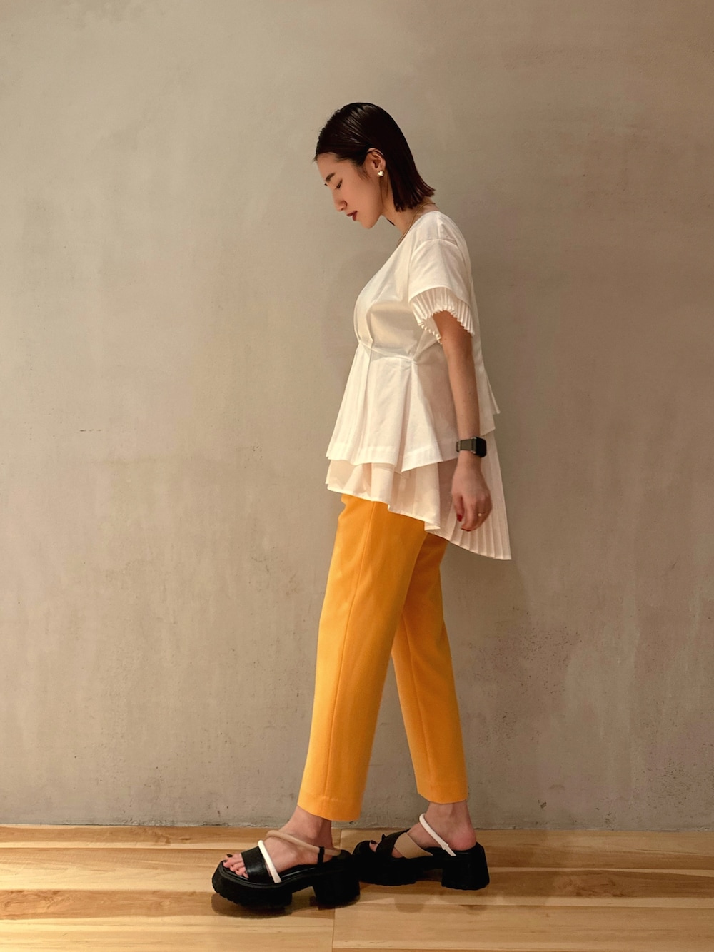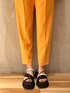 ◤ 2023Summer PRE ORDER ELENDEEK 定番 ──────── バックプリーツデザインが目を惹く 一枚でサマになるブラウス☺︎💐 ① トップス : 昨年も大人気。入荷しては即完売を繰り返したバックプリーツブラウス。今年もバージョンアップして登場!ヒップをカバーしてくれるアシメトリーデザインと、幅広めの半袖丈のお袖が嬉しい♡ 私はカラーパンツが大好きなのでホワイトを選びました..✨Vカットはさほど深くないので胸元も安心。自然にくびれをつくりだしてくれるウエスト切替デザイン◎ ② パンツ : ELENDEEKの大黒柱ともいえるテーパードパンツ。154cmでもジャスト丈で履けて、ヒップを綺麗にみせてくれる美シルエットパンツはお気に入りすぎて私は現時点で4色持っております🤭💕 00サイズで足首がしっかりでて、01サイズでくるぶしが隠れました。今回私は00サイズを着用✓ 150cm前半の方もお直しなしで履いていただける00サイズ。おすすめです! ③ サンダル : サンプルの為38着用。私は普段足のサイズが22.5-23cm。幅狭&甲低タイプの私は37でも大きかったので、幅広&甲高タイプの方は履いていただきやすいかと思います..✨ カラーもの苦手な方もお顔から遠い足元からカラーをはじめる '' mix " はいかがでしょうか? 是非チェックなさってください🌼