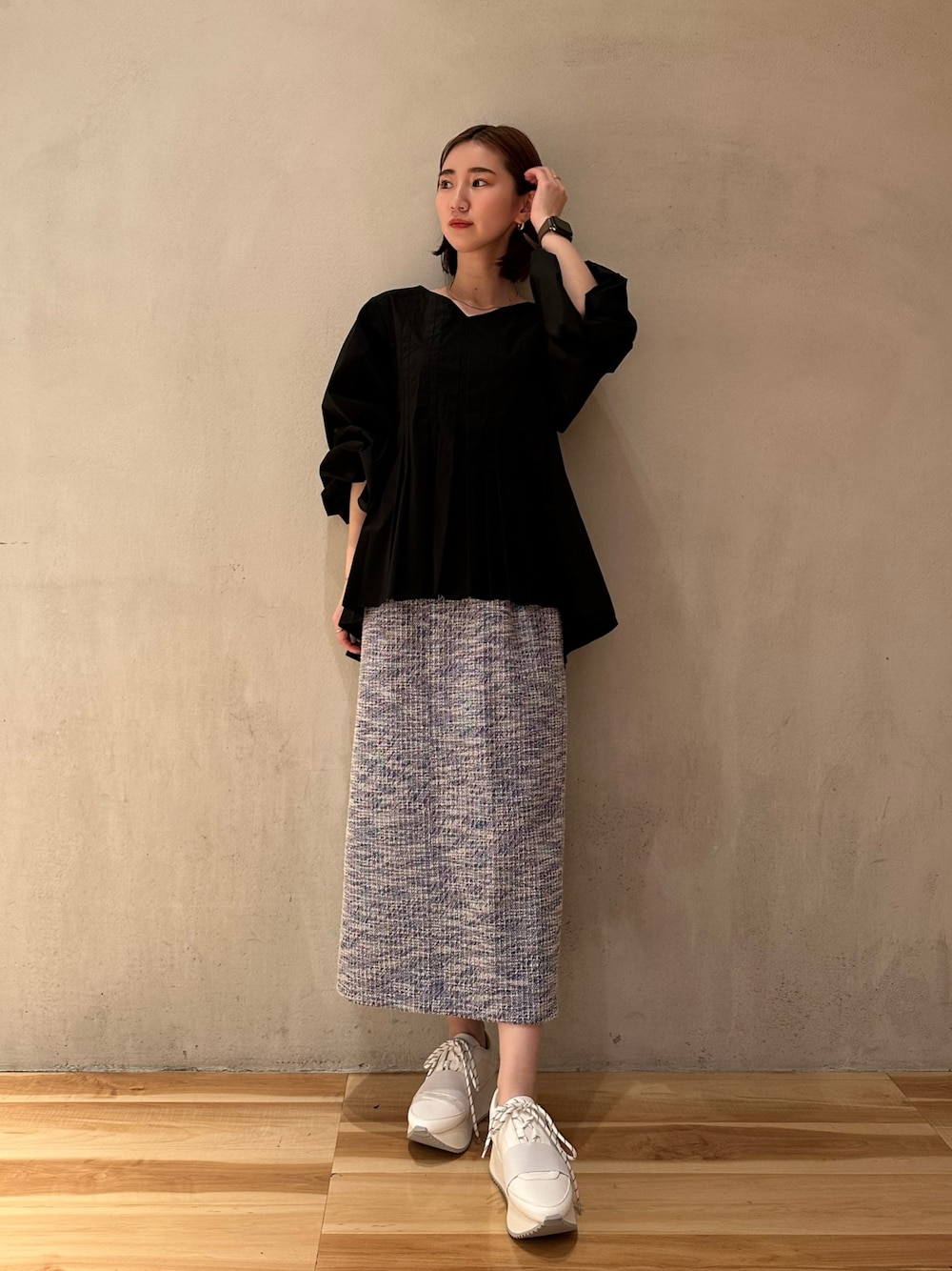 ◤ PRE ORDER キレイめカジュアル 色を楽しむ女性らしいスタイリング ──────────────── ① ブラウス : 後ろ姿もカワイイELENDEEK拘りのバックコンシャスブラウス。バスト下から程よくふんわり広がるタックフレアがお腹周りをナチュラルにカバーしてくれます...✨ ボトムスを同系色のブラックで上下揃えるとガラッとフォーマルな印象になら格好良くお召いただけるオン/オフ使いやすいアイテムです◎ 袖口はゴムになっているので、腕をまくってもずり落ちてこないところも嬉しいポイント! ② スカート : 154cm02サイズ/ウエストを1つ折りして着用。それぞれ柄違いのジャガード素材のスカート。わたし着用のブルーは伸縮性あるツイード風のジャージー素材を使用しております🍃 からだのラインを広いすぎない程よいタイトなので、居心地◎ ぴたっとしたリブニットはもちろんブラウスやスウェットなどゆるさのあるトップスとも相性抜群です! 是非チェックなさってください♡