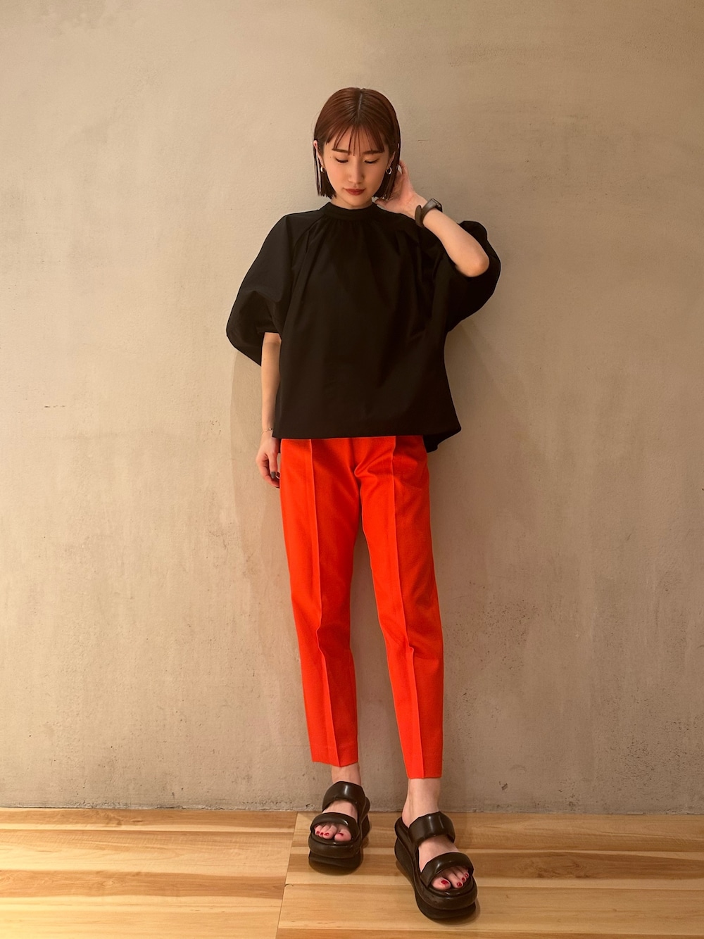 辛口モードスタイリング ──────────── ① ブルゾン : 羽織りと、ブラウス。1着で2着楽しめる万能アイテム。カラーによって生地が異なり、ブラックはコットンをたっぷり使用しているリネンのような風合い特徴。ブラックでも軽やかな印象に🍃 お袖のボリュームがとても可愛くてお気に入り♡ 5分袖だからロングシーズン活躍しそう..✨ ② ボトムス : 5色買いしたイージーテーパードパンツがバージョンアップ!リネンのような風合いタッチの生地になりました◎ レッドは裏地がついていないので夏も快適。履いて感動。真っ赤というより若干オレンジがかったのような赤。強い印象というより、凛とした女性らしさを感じられるお色みです♡ 154cm_00(xs)ジャストでした!私はまずはじめにベーシックなオフオワイトを購入しましたが、レッドも購入します👏🏼👏🏼 ③ サンダル : 履き心地ふわふわふかふか。ベルト部分も同じ素材なので、痛くならないサンダル。夏に重宝間違いなしなので、私は黒色を購入!6cm高さがあるのに、全くしんどくならないところが154cmの私には嬉しいポイント♡ 普段足のサイズ22.5~23cmで37サイズで◎ 足の裏とソールが離れにくいので、ぱかぱかならず7.5h立ちっぱなしのお仕事も平気で履けております! 是非チェックなさってください☺︎