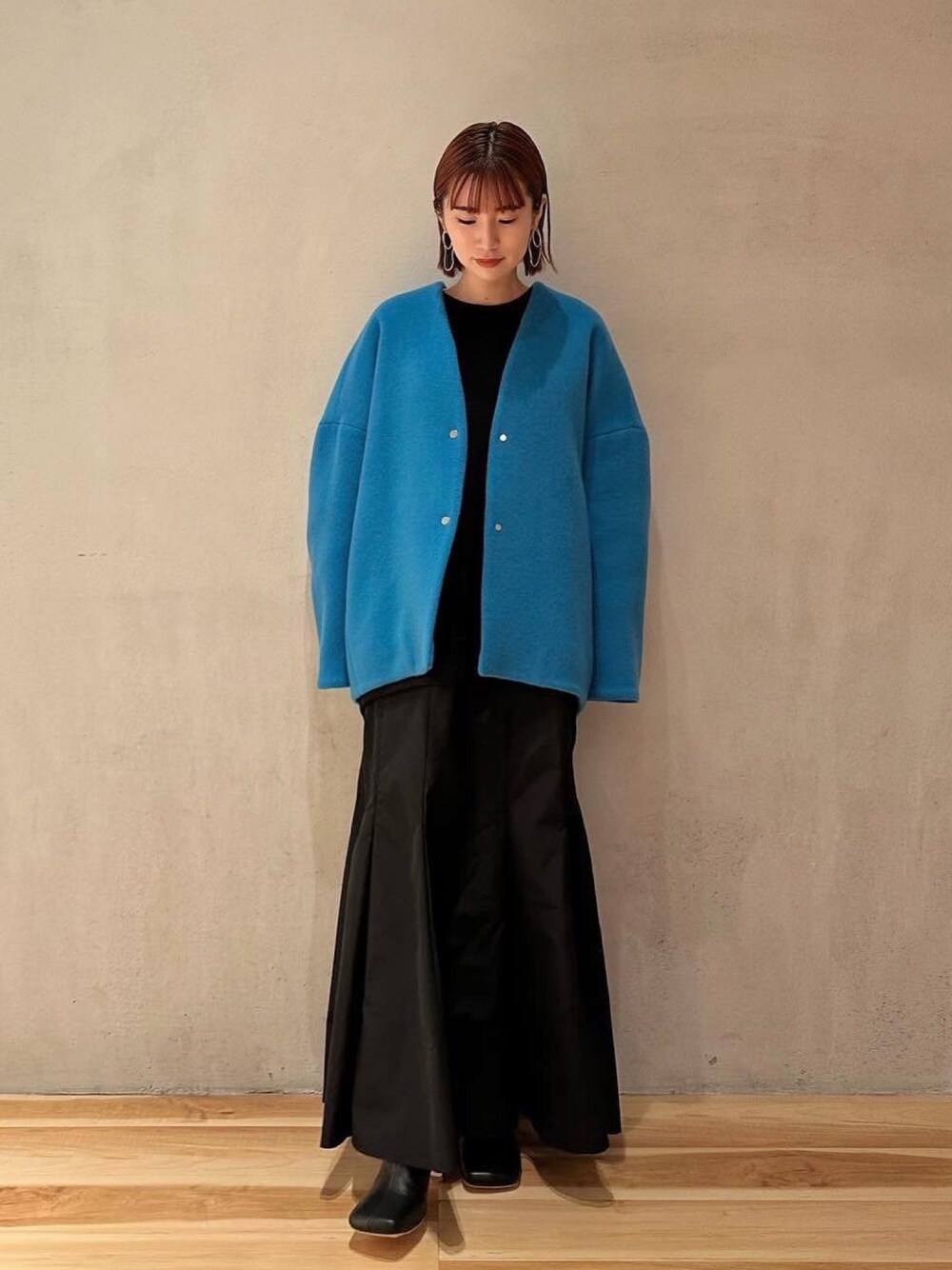 akari(ELENDEEK)のノーカラーコート「フォルムショートウールコート」を使ったコーディネート