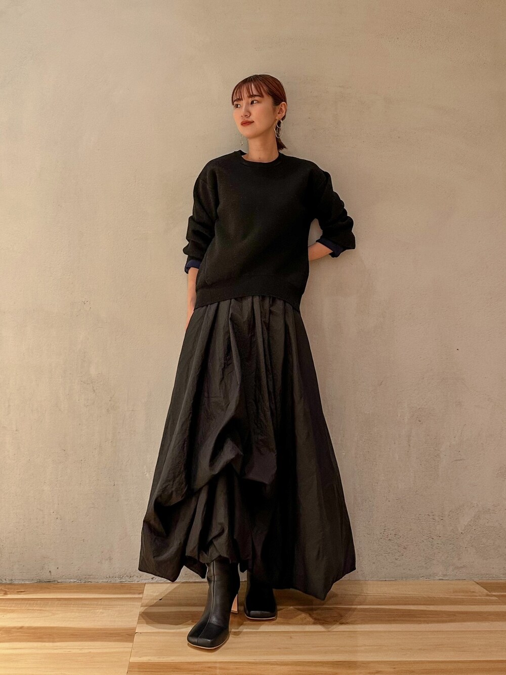 オトナのセットアップ風コーデ ◼︎ ニット 秋冬春のマストアイテム。程よいゆるさがありつつもショート丈なのでカジュアルすぎず綺麗めとして着れるのがポイント。裏地がバイカラーになっているので、一つ折りして配色を楽しんだり、単色で着ても◯ ◼︎ スカート ELENDEEK オリジナルバルーンデザイン。人気のワンピースに続き、スカートバージョンが登場しました。裾をアシメトリーに引き上げることで立体感ある動きの見え方に。丈を長めにしているのでオトナモードな雰囲気になります。 是非チェックなさってください。