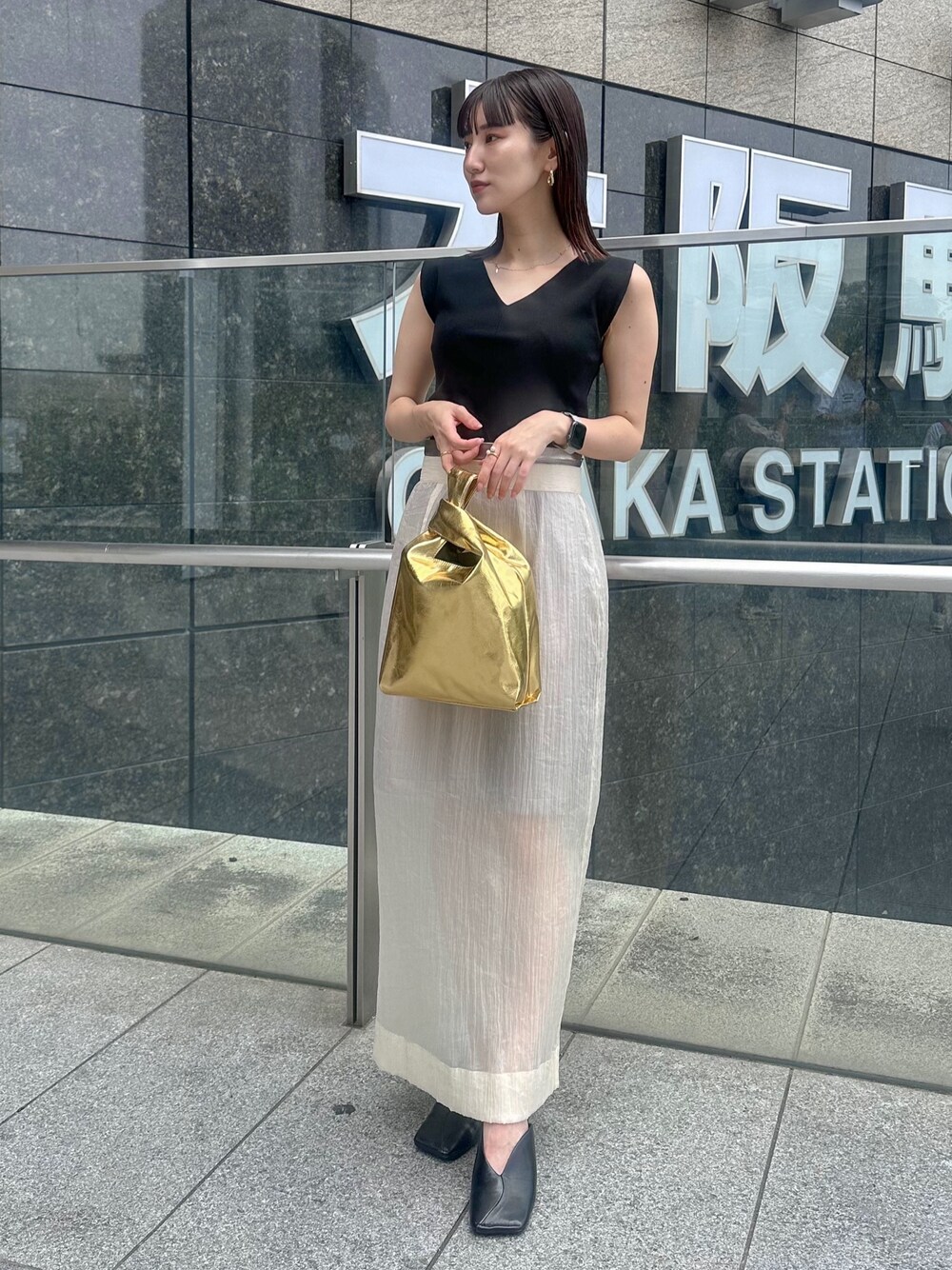 METALLIC × SHEER 今っぽさを取り入れたスタイル ◾︎ ニット 程よい肉感でマルチにスタイリングできるニットタンク。スタンダードにタンクトップとして、肩を下ろしてオフショルとして2WAYで着用可能◯ インナーにシャツを合わせてビスチェのようなスタイリングも楽しめます。 ◾︎ スカート 撮影時02着用。普段00~01が多いわたしで02は指3本はいるほどのゆとりでした。裾はフラットシューズでも◯ 今季注目されているミニスカート×シアー。それぞれ別に着るのも良し。ミニスカートを上から重ねて着ても良し。1着で幅広く楽しめるスカートです。シアー感は透けすぎないので、オトナもミニ丈を楽しめます。 ◾︎ バック 500㎖のペットボトルもなくなく入るサイズ感。コンパクトだけど荷物もしっかり入ります。スタイリングに+αするだけで、今年っぽくアップグレードされるので、METALLICまだお持ちでない方は是非挑戦なさってください。
