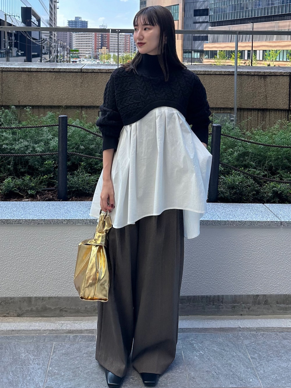 2024.9.26 川上桃子さんコラボライブ ご紹介アイテム ◾︎ ニット ケーブルニットに布帛をドッキングしたトップス。ケーブル柄をアシンメトリーに配置し、デザイン性のある見え方に。シャツ地とのドッキング位置を重なっているような見え方にし奥行きのある印象になります○ シャツ地部分はタックを取り、裾にかけて広がるAラインシルエット。ロング丈なので下半身カバー効果抜群。 バスト周りもスッキリ見えるラインに。 ◾︎ ボトムス 秋冬らしさがぐっと増すヘリンボーン。ロング丈なので高身長の方におすすめ。私は155cm 8.5cm ヒールのブーツで01サイズを着用。 無地っぽく見えるヘリンボーンなので、柄初心者の方も挑戦しやすく、落ち着いた色みなので合わせやすさもございます○ ◾︎ ブーツ 柔らかな牛革を使用したブーツ。履けば履くほど足に馴染みます。スクエアトゥなのでつま先が痛くなりにくいのが特徴。毎年歩きやすいと好評のアイテムです。22〜22.5cm 37ゆとりあり。分厚い靴下履くと◯ ◾︎バック 500㎖のペットボトルもなくなく入るサイズ感。コンパクトだけど荷物もしっかり入ります。スタイリングに+αするだけで、今年っぽくアップグレードされるので、METALLICまだお持ちでない方は是非挑戦なさってください。