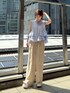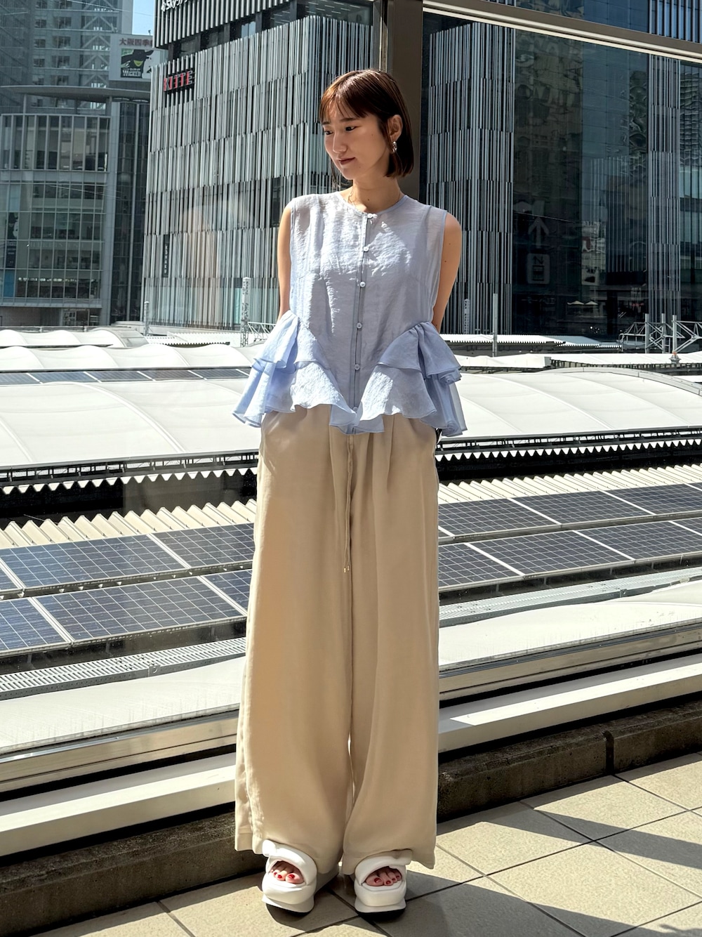 清涼感あるカラーコーディネート ◼︎ ブラウス 程よいシアーが大人healthyに。甘い印象を抑えてくれ、大人っぽくフリルをお召しいただけます。セットで付いているキャミはアジャスター付きで長さ調整できるので、胸元シアーが苦手な方は短めに設定すると◯ 軽やかな素材で風に靡くシルエットが魅力的な1着。毎年即完売するアイテムですのでお早めに。 ◼︎ ボトム 夏におすすめしたいシアーワイドパンツ。サンプルのため155cm 02着用。ELENDEEK厚底サンダル着用で擦らずに履けました。ウエストオールゴムでとにかく楽。ストレスフリー。足に生地が当たりにくいから真夏も涼しく快適に過ごせます。シアーですが、裾3cmほどだけのシアーなのでトレンド感強すぎずお召しいただけます。 ◼︎ サンダル 毎年好評走れる厚底サンダル。高さ8cmあるのに驚きの安定感。沢山歩く日こそ選んでしまう1足です。私は22.5cm 37着用。かかとゆとりありますがふわふわツーバンドクッションがしっかりフィットしてくれるので脱げる心配なし。 ぜひチェックなさってください!