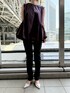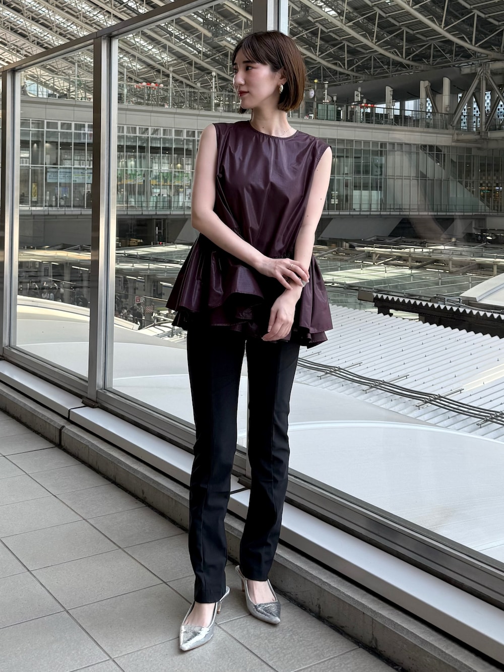 ■ トップス 薄手のローン素材に生地の表面に光沢感を与えるチンツ加工を施したペプラムブラウス。ベース素材が軽やかで清涼感あり暑い時期でもサラッと着やすい晩夏にぴったりの1枚。エッジの効いた素材感とペプラムの女性らしい華やかなデザインがブランドらしさたっぷりです。 ■ ボトム 縦横にしっかりとストレッチ性があり非常に穿き心地の良いスティックパンツ。ストレッチ性抜群ですが身体のラインがひびきにくい、しっかりとした素材感でシルエットを綺麗に見せてくれる万能アイテム。センターに切り替えラインを入れる事で縦長効果もあり、よりスッキリと細見えでスタイルアップ効果◎ 155cm 01 足の甲にすこしかかるくらいですが、履く位置や太もも等足の幅でやや丈は変わるので個体差ございます。 ■ シューズ 足のサイズ22.5cm幅狭め&甲低めで37(23〜23.5cm)ジャストサイズ。かかとゆとりありますが、足の甲とかかとを止める部分が隙間がないジャストサイズなので歩く時も紐がかかとから落ちたりがばがばしたりしませんでした。幅広め&甲高めの方は普段37でも38(24~24.5cm)の購入がおすすめです。ヒールの高さは7cmですが私の体感は3cm。全くしんどさがないので店頭用としてシルバー37をリアルバイ済。 是非チェックなさってください。