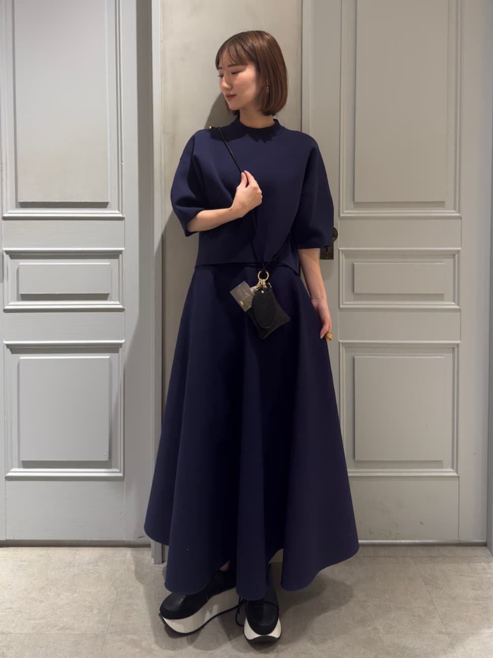 ◾︎ トップス しなやかなハリ感がある糸で編みたてたフォルムニット。程よいツヤとさらっとした風合いの春らしい軽い素材感で着心地抜群。バランスの取りやすい丈感でボリュームあるボトムとも相性良くスタイリングしやすいトップ。シンプルながら袖の程よいフォルムがポイント。ネイビーはお袖をまくるとELENDEEKらしいバイカラー(パープル)が見えるのでお袖折るのも○同素材のニットフレアスカートとのセットアップがおすすめです。 ◾︎ スカート 程よいツヤとさらっとした風合いの春らしい軽い素材感で着心地抜群。ニットのハリ感がフレアシルエットを引き立て女性らしさを演出。腰回りはスッキリしておりスタイルアップ効果抜群。ウエストオールゴムなのでストレスフリーな履き心地。 ◾︎ スマホショルダー スマートフォンを身につけて持てるミニマルなショルダーアイテム。オーバル型ミラーとミニポーチを備え、ポーチ外側のカードフォルダーや内側のチェーンで鍵もスマートに固定可能。必要なものをひとつにまとめ軽やかに街を移動できる、大人の洗練スタイルに寄り添うアイテム。