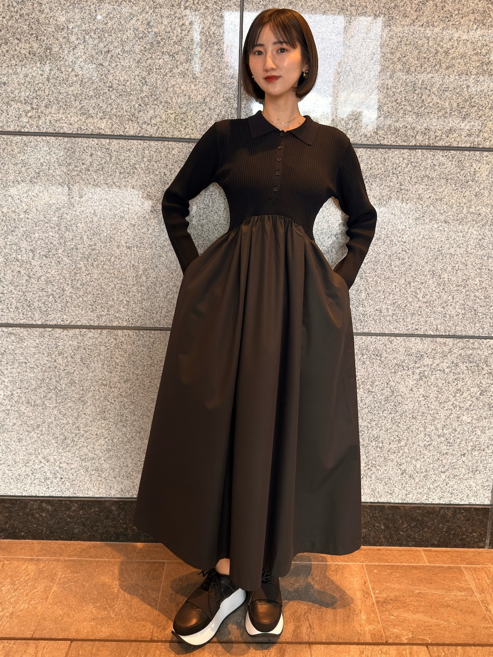 ◾️ワンピース リブドッキングフィット&フレアワンピース。スカート部分にハリのあるシャツ地をドッキングし、メリハリをつけた女性らしいフィット&フレアシルエット。ウエスト切替にカーブをつけてスタイルアップするバランスに◯ニット部分はリブ組織でリラックスフィットし、腰回りや体のラインを拾いすぎないサイズ感が◎。袖口はチュールをレイヤードし、手元にさりげないアクセントを効かせたデザインもデザインポイント。店舗では普段使いはもちろんキチンと見えしたい特別な日のお洋服として選ばれる方も多いです。 ◾️シューズ サンプルのため37着用。定番人気の厚底スニーカーから新色が登場。スポーティー過ぎないどこか上品見えするスニーカーは、歩きやすくスタイルアップできるボリュームソールがスタイリングの鮮度をアップ。細かく配色やマテリアルを切り替えたこだわりのデザイン。カジュアルスタイルはもちろん、きれいめコーディネートのはずしとしても◯ELENDEEK(エレンディーク)らしくあえてスカートやワンピースと合わせたスタイルがおすすめ。22.5cmで36ちょうどよく履けています。よく歩く日こそ選びたい楽ちんシューズ。