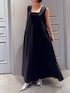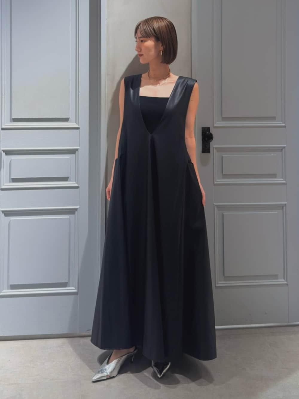 ◾️ ワンピース バックベルトAラインワンピース。テントラインのシルエットが描くやわらかな広がりが魅力のジャンパースカート。後ろ身頃には太めのベルトデザインを施し、インナーカバーをしながらレイヤードも楽しめる仕様に。動くたびに揺れる分量感が印象的で、1枚でスタイリングが完成するアイテム。アイテムサイズが01サイズバスト98cmと02サイズ100cmで2cmの差。店舗ではサイズではなく長さで選ばれる方が多いです。バックベルトが太めなので肩からずり下がることがないジャンスカ。嬉しいポイントです♡ ◾️シューズ 深めのカッティングが足をきれいに見せてくれるポインテッドトゥミュール。アシンメトリーに素材をクロスしたデザインでさりげなくモードな印象に◯ 少しシワ感のあるメタリックな素材がコーディネートのアクセントになり、傷や汚れが目立ちにくいのが嬉しいポイント。少し内側に入った滑らかなヒールは、スタイルアップできつつ安定感のある高さ。インソールに低反発クッションが入っているので、クッション性が高く疲れにくいのが選ばれる理由。店舗でも愛用しているスタッフが多い一足です。