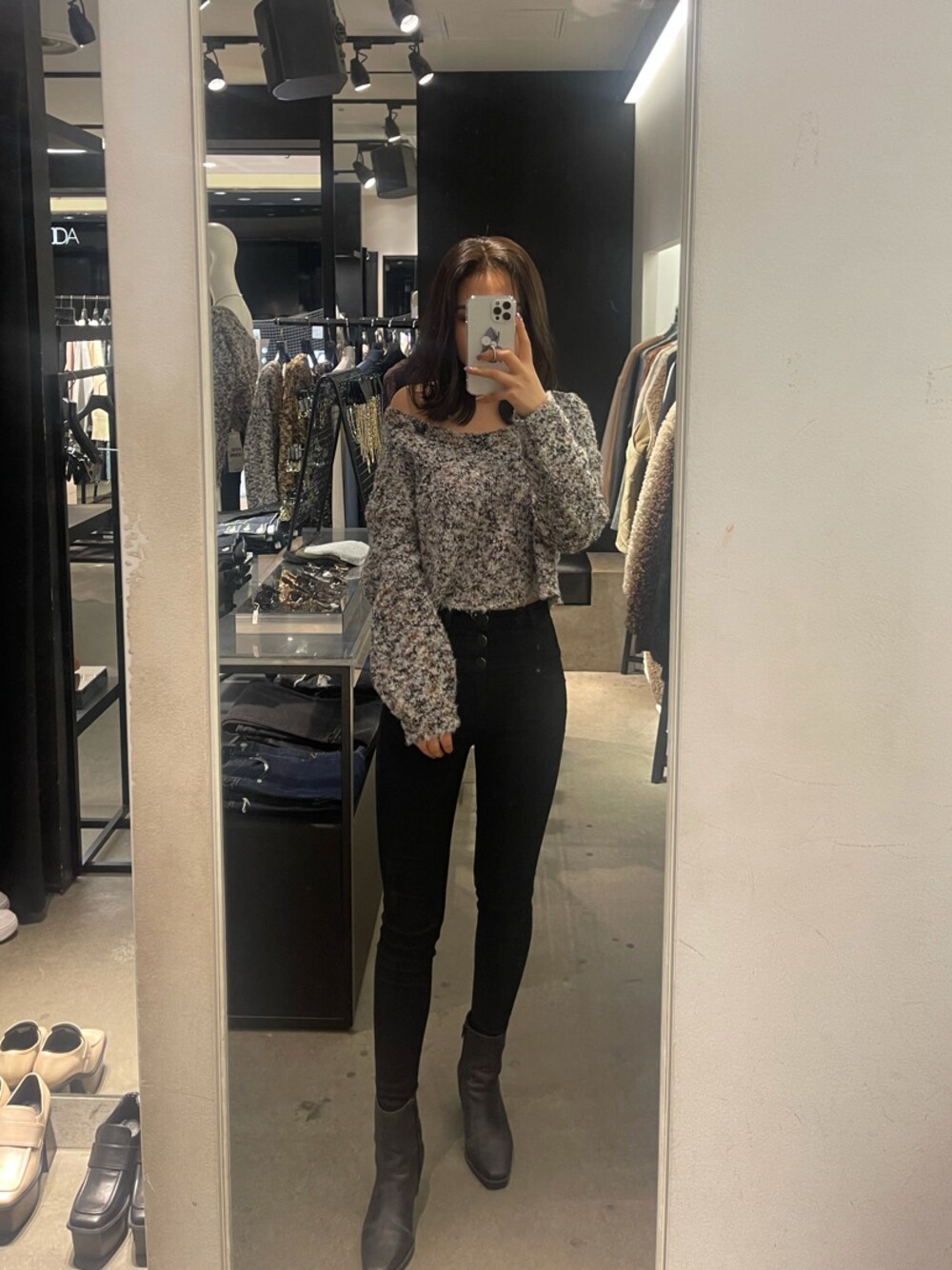 ミックス柄のショートニット❤︎シンプルな形なのに存在感が抜群です!普通のtopsならスキニースタイルだとシンプルすぎますが、このtopsでしたら一枚着るだけでお洒落に見えますよ♪お気に入りの最強美脚デニムとブーツでEMODAらしいスタイリングにしました!